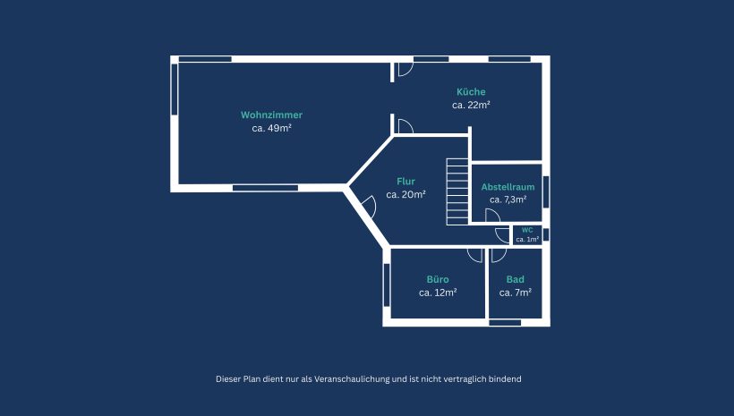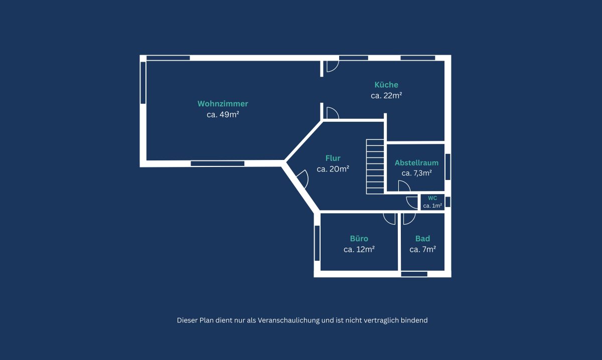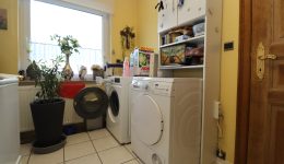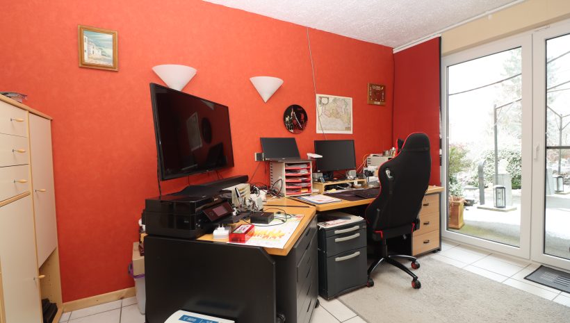 Im Erdgeschoss befinden sich der Eingangsbereich mit Zugang zu einem großzügigen Wohnbereich von 49m² (Wohn- und Esszimmer) sowie zur voll ausgestatteten Küche, ein Badezimmer, ein separates WC, eine Waschküche sowie ein Büro, das auch als Schlafzimmer genutzt werden kann.