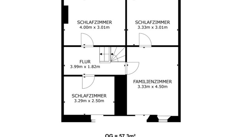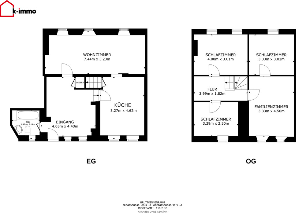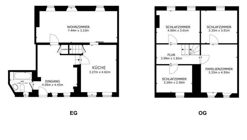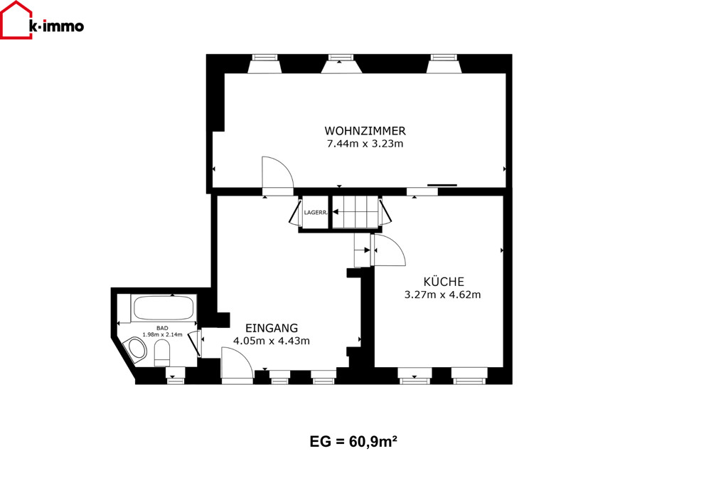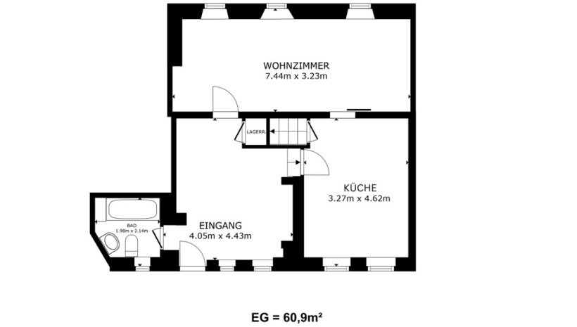 – Wände: Putz tapeziert, Holzfußleisten, Türen aus Holz, Fensterbänke aus Holz