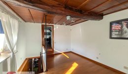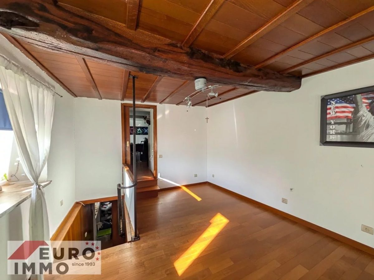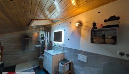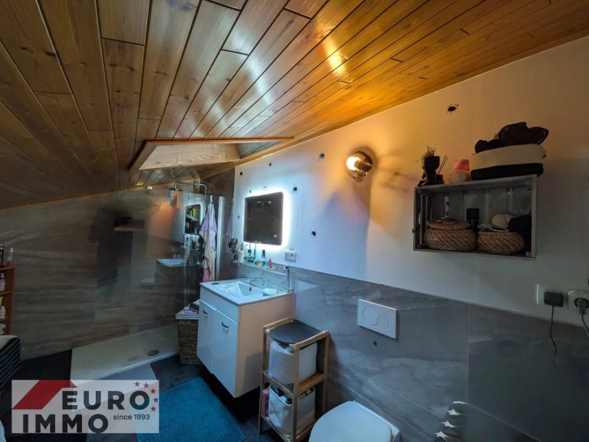 Über eine weitere Holztreppe gelangt man in das Dachgeschoss, das ein modernes Badezimmer mit italienischer Dusche, Waschbecken, WC und Dachfenster beherbergt. Zusätzlich befindet sich auf dieser Ebene ein weiteres Schlafzimmer mit etwa 16 m², das sich hervorragend als Elternschlafzimmer, Gästezimmer oder Homeoffice nutzen lässt.