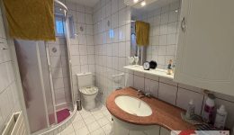 Auf dieser Ebene befinden sich außerdem ein ca. 4 m² großes, vollständig gefliestes Duschbad mit Dusche, Waschbecken und WC sowie ein erstes Schlafzimmer mit ca. 17 m². Dieses im Erdgeschoss gelegene Schlafzimmer ist mit Laminatboden ausgestattet und bietet einen schönen Blick auf den Garten und die umliegende Natur – Ruhe und Komfort sind hier garantiert.