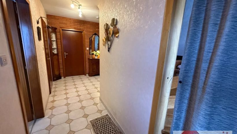 Die Wohnfläche beträgt ca. 105 m² und wird durch eine Nutzfläche von etwa 65 m² im Untergeschoss ergänzt. Der Zugang zum Haus erfolgt über einige Stufen, die in eine einladende Eingangsdiele von ca. 8 m² führen, von der aus alle Räume harmonisch erschlossen werden.