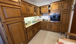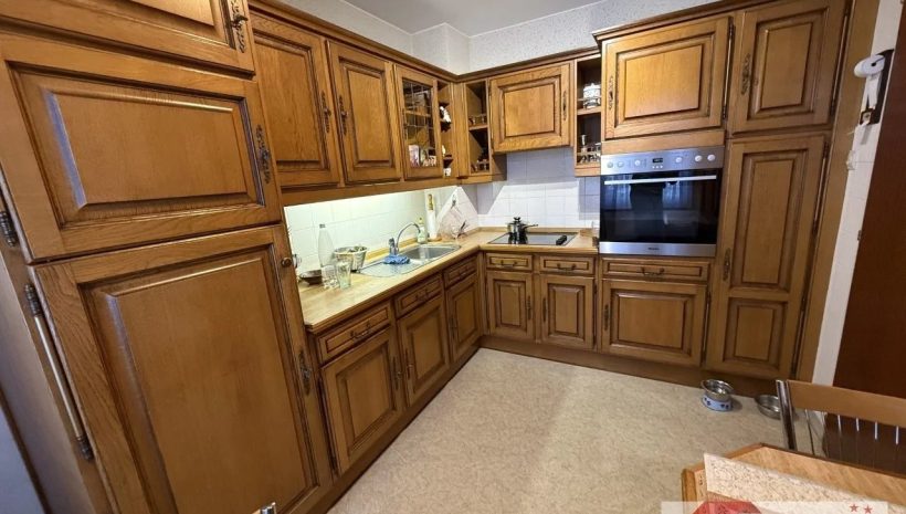 Die Küche mit einer Fläche von ca. 8 m² ist zeitlos in Massivholz-Eiche ausgestattet und verfügt über einen kürzlich erneuerten Kühl- und Gefrierschrank sowie Backofen.