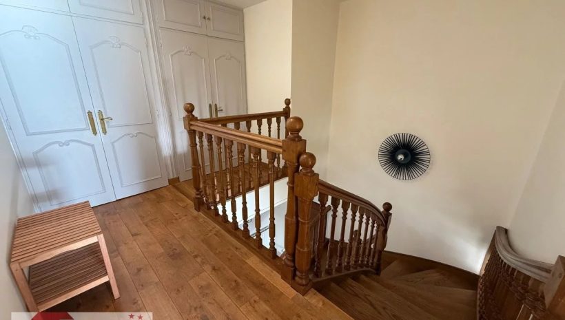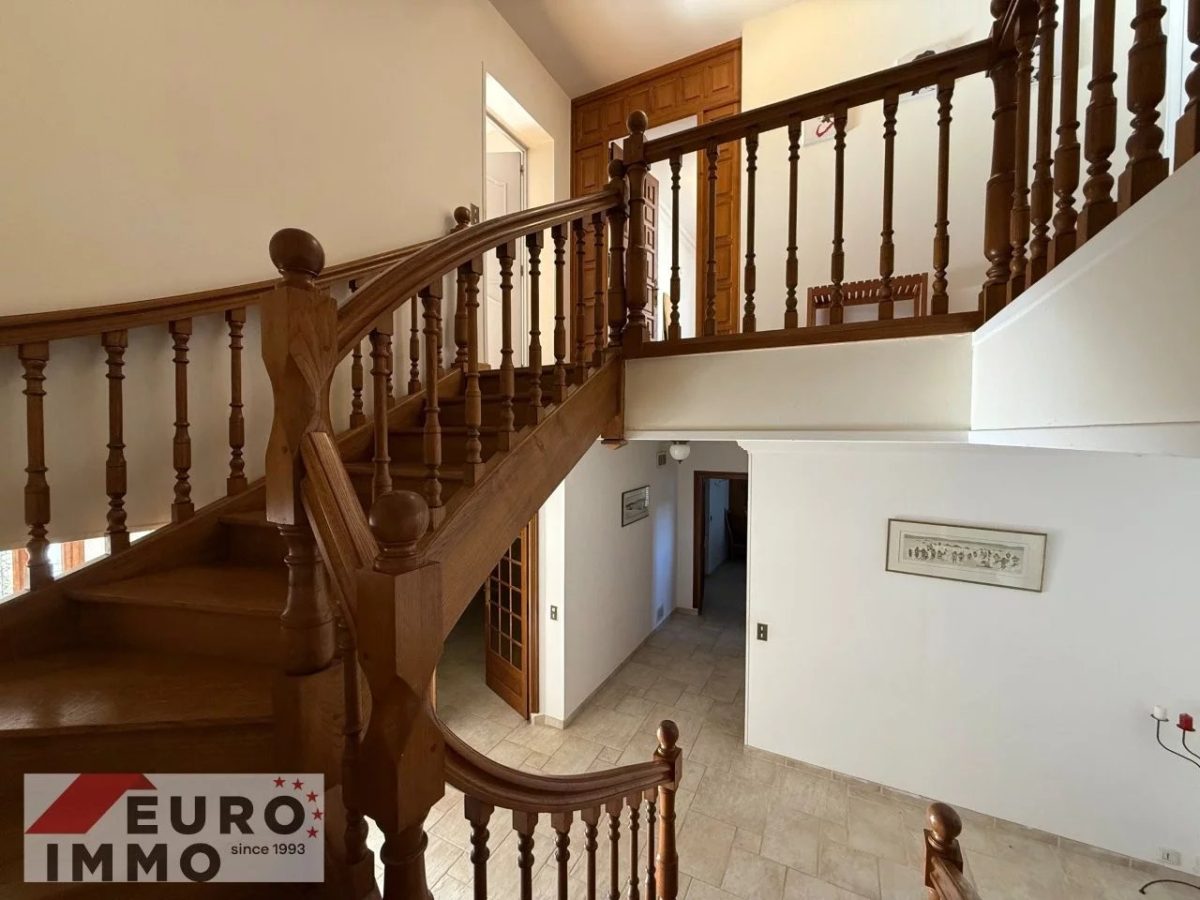 Das Obergeschoss, erreichbar über die eindrucksvolle Massivholztreppe, beherbergt den Schlafbereich mit vier Schlafzimmern und einem Flurbereich. Alle Schlafzimmer sind mit Massivholzparkett und charaktervollen Türen ausgestattet und bieten angenehme Raumgrößen sowie eine behagliche Atmosphäre. Das Hauptbadezimmer aus Marmor verfügt über hochwertige Ausstattungen wie eine bodengleiche Dusche, eine Whirlpool-Wanne, ein Doppelwaschbecken und ein WC. Ein zusätzliches Duschbad ergänzt diese Etage und erfüllt die Anforderungen einer Familie oder von Gästen in idealer Weise.