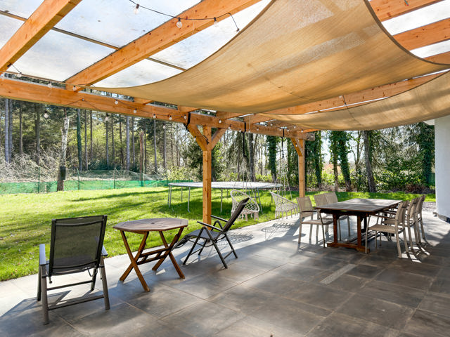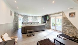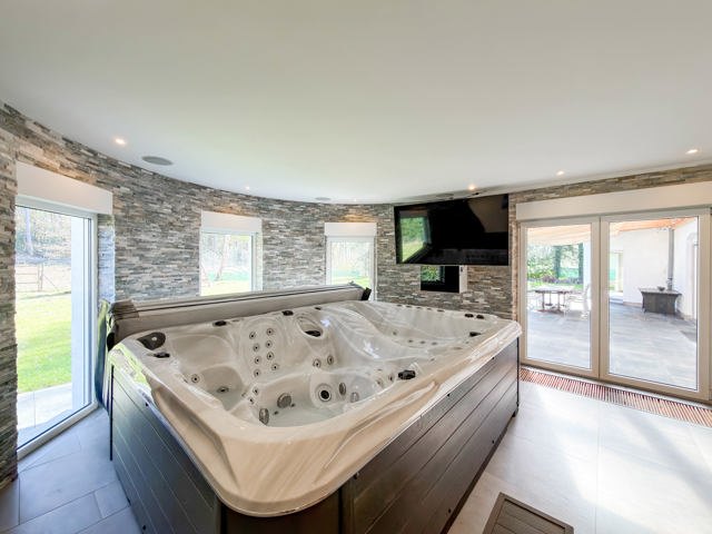 Ein besonderes Highlight ist der Wellnessbereich mit Jacuzzi und Sauna sowie Zugang nach außen, der für ein hohes Maß an Lebensqualität sorgt. Im Obergeschoss befinden sich acht Schlafzimmer, darunter ein beeindruckendes Spielzimmer von 75 m² sowie ein Fitnessraum, die vielfältige Nutzungsmöglichkeiten bieten.