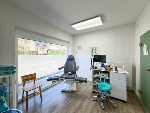 Das Erdgeschoss mit 265 m² umfasst unter anderem zwei getrennte Gewerbebereiche, darunter eine Praxis von ca. 105 m² mit Empfang und drei Behandlungsräumen, ideal für Freiberufler oder eine Kombination aus Wohnen und Arbeiten. Der Wohnbereich besteht aus einem großzügigen Wohnzimmer mit integriertem Heimkino sowie einer offenen Küche, die direkten Zugang zu einer 40 m² großen Terrasse bietet.