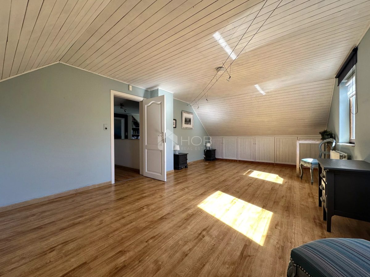 Auf einem Grundstück von 706 m² gelegen, öffnet sich die Liegenschaft zu einem wunderschön angelegten Garten, der dank Mähroboter stets gepflegt ist. Die Terrasse lädt zum Verweilen ein, während der Balkon einen beruhigenden Panoramablick auf die umliegende Natur bietet. Eine Garage, ein Carport sowie ein Gartenhaus runden dieses stimmige Gesamtbild ab.