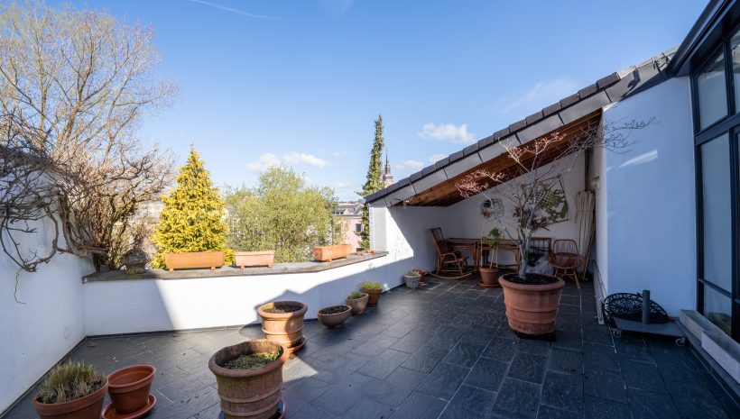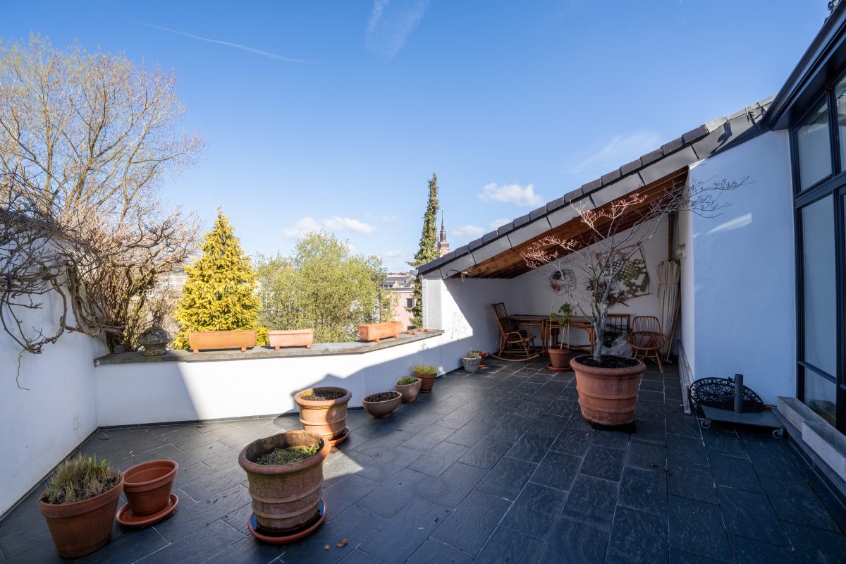 Im zweiten Obergeschoss öffnet sich der großzügige Wohnbereich mit Küche, Esszimmer und hellem Wohnzimmer. Große Glasflächen, eine Empore sowie der direkte Zugang zur Dachterrasse schaffen ein beeindruckendes Raumgefühl. Von hier aus genießen Sie einen schönen Blick ins Grüne und auf den angrenzenden Park.