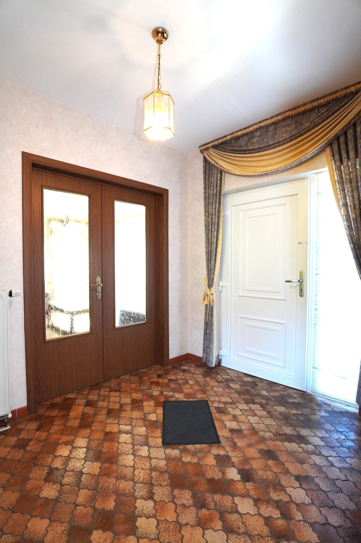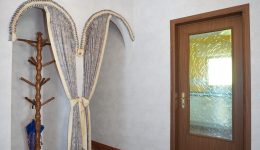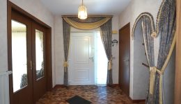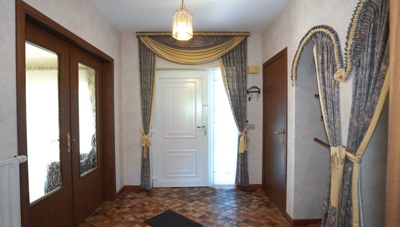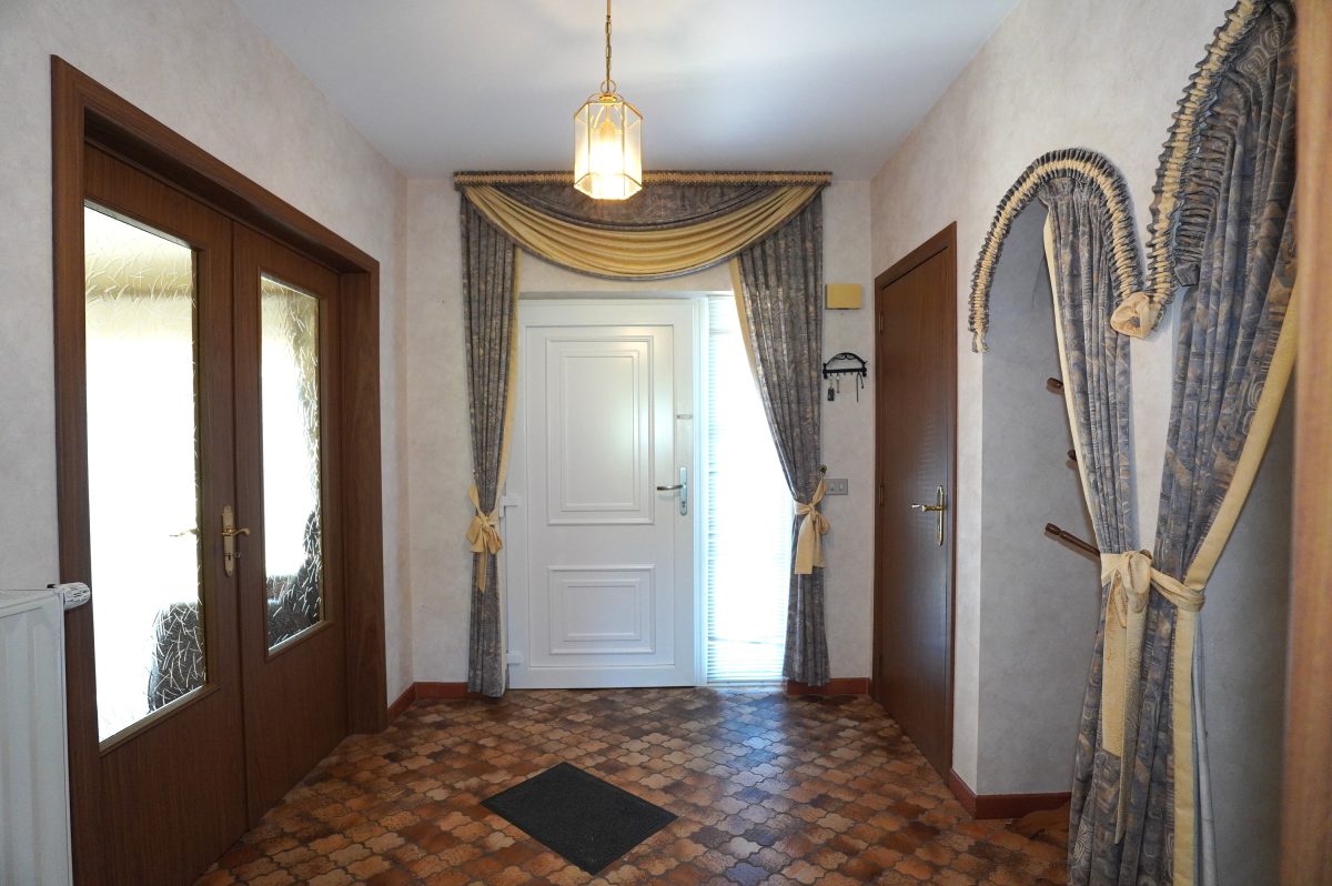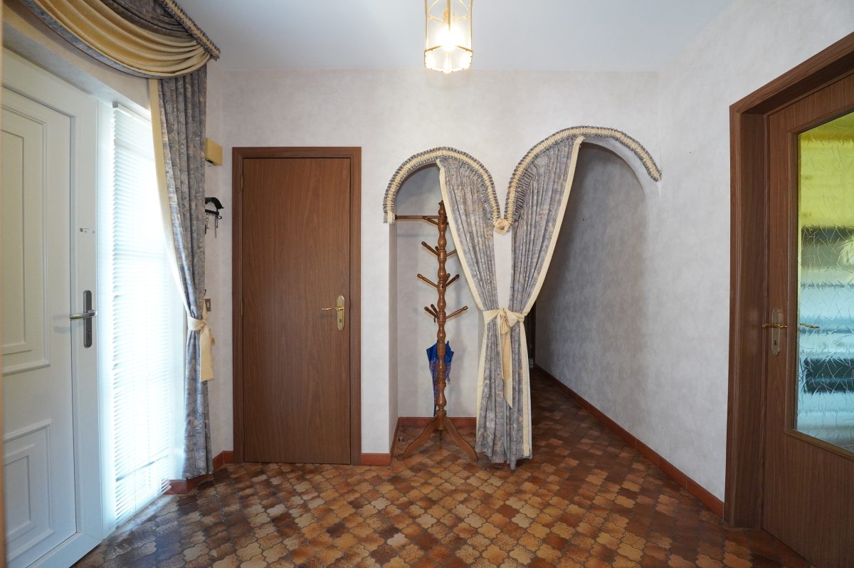 Der einladende Eingangsbereich führt zu allen Räumen des Hauses, umfasst ein separates WC sowie einen Garderobenbereich, der durch eine gewölbte Öffnung dezent abgetrennt ist. Durch eine verglaste Holzdoppeltür gelangt man in das geräumige und lichtdurchflutete Wohnzimmer, während die Einbauküche einen direkten Zugang zum Außenbereich bietet.
