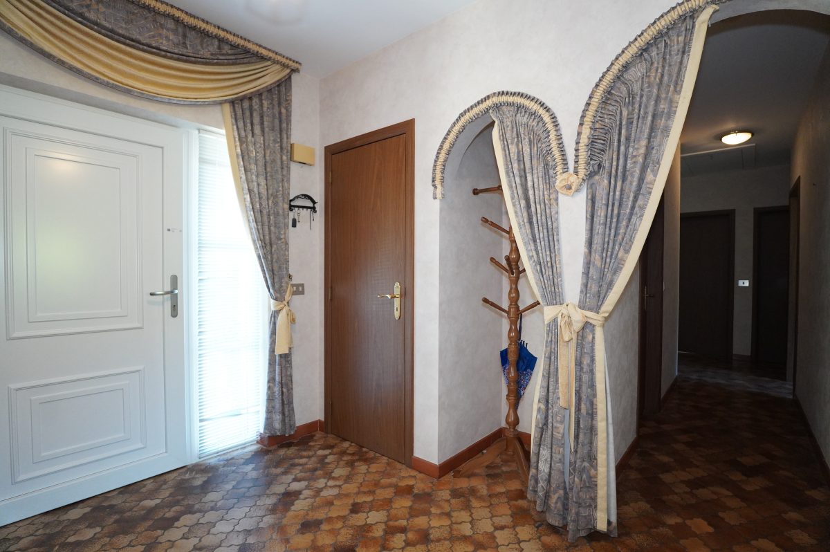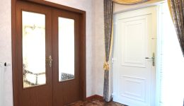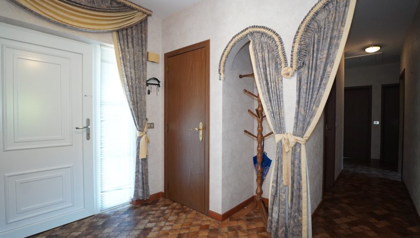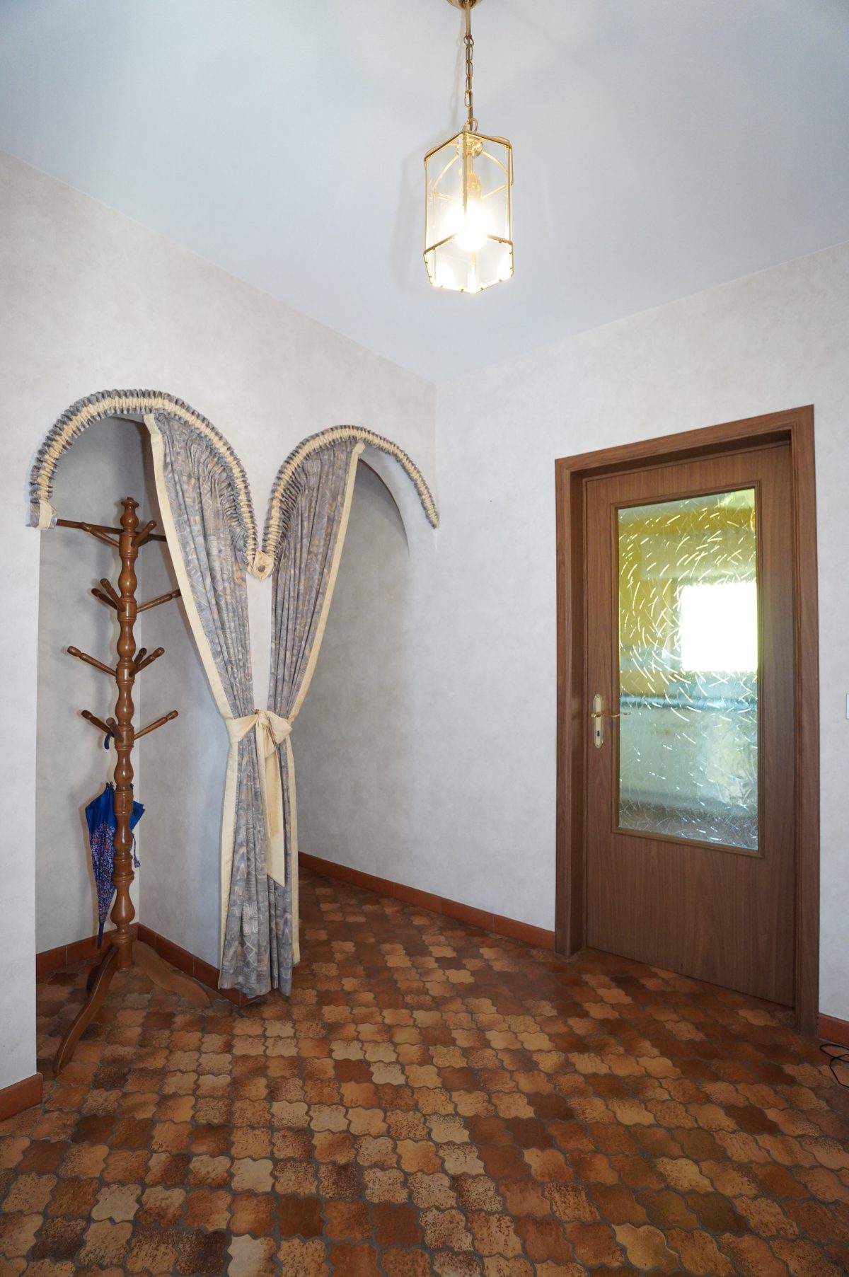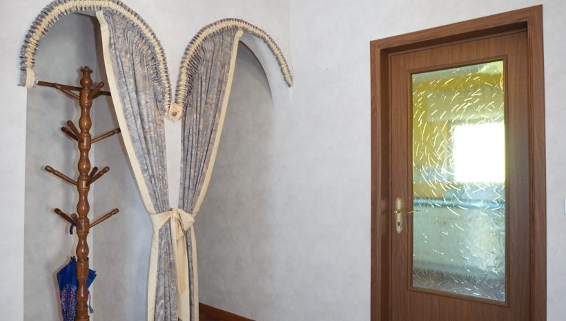 Der einladende Eingangsbereich führt zu allen Räumen des Hauses, umfasst ein separates WC sowie einen Garderobenbereich, der durch eine gewölbte Öffnung dezent abgetrennt ist. Durch eine verglaste Holzdoppeltür gelangt man in das geräumige und lichtdurchflutete Wohnzimmer, während die Einbauküche einen direkten Zugang zum Außenbereich bietet.