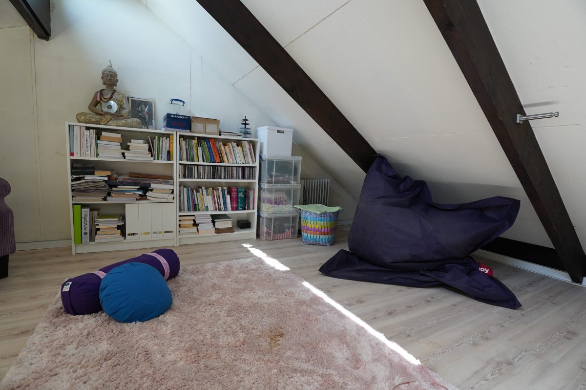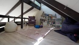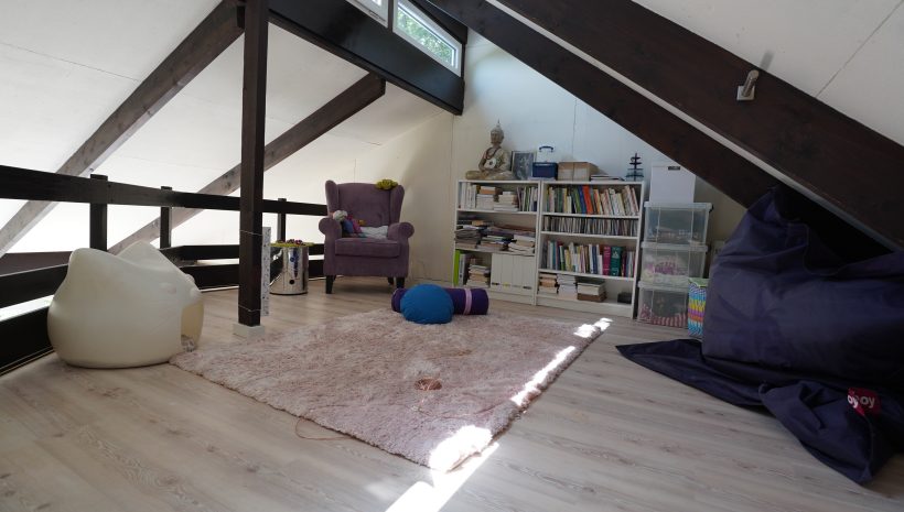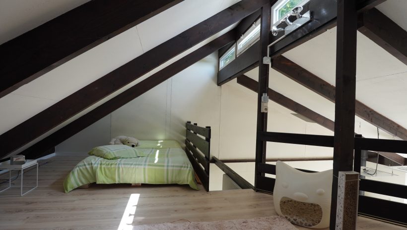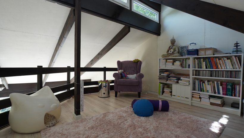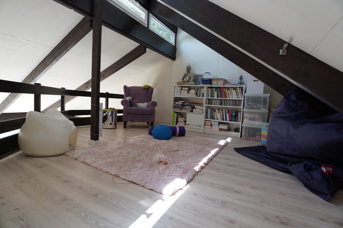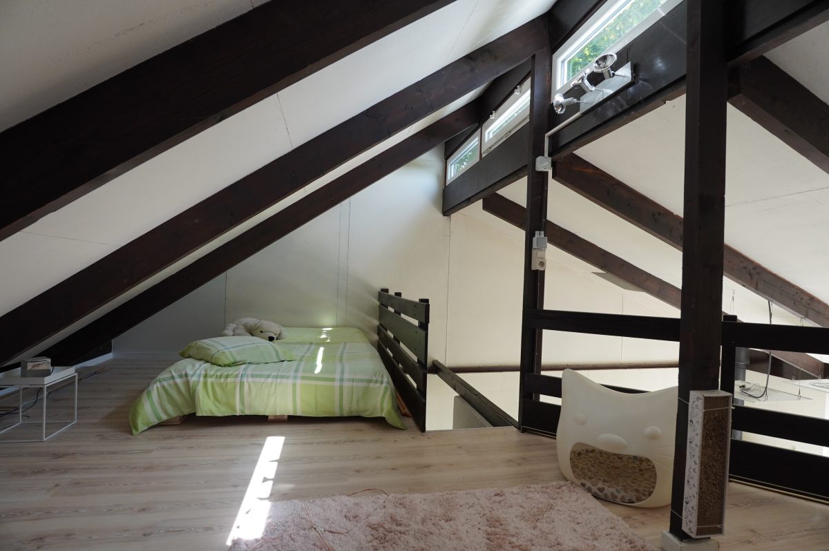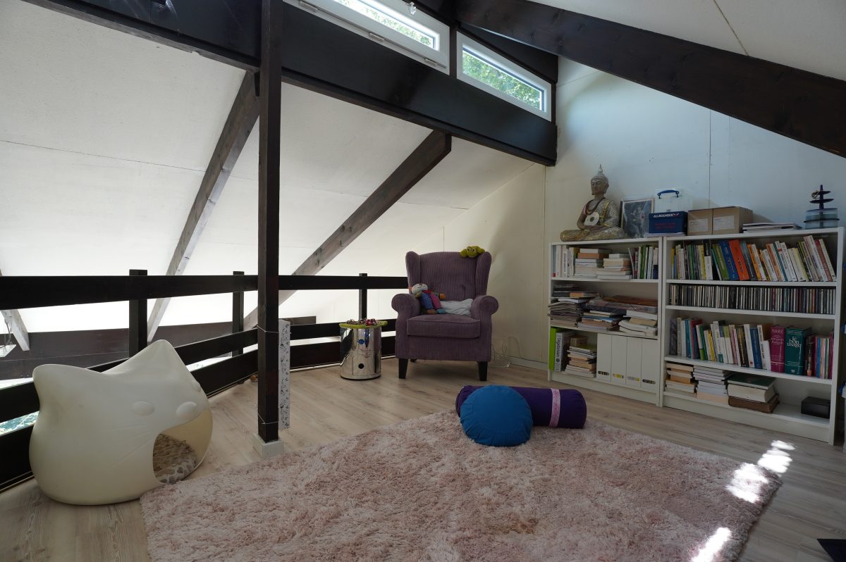 Im Obergeschoss nimmt ein geräumiges Mansardenzimmer diesen hellen Dachraum ein.