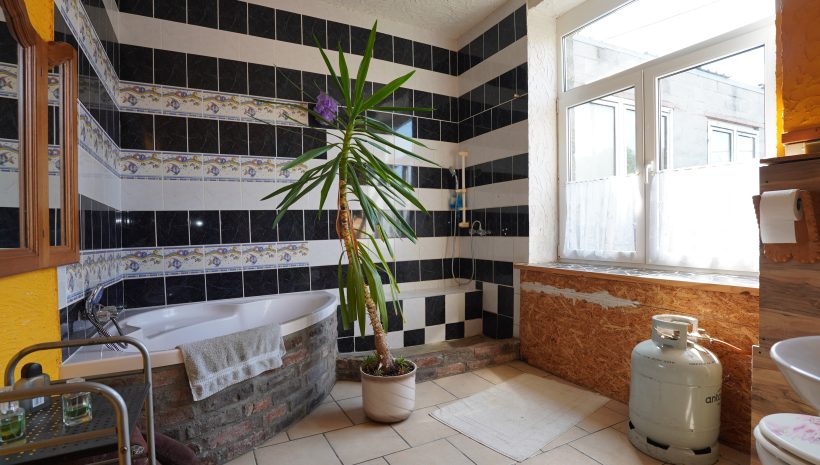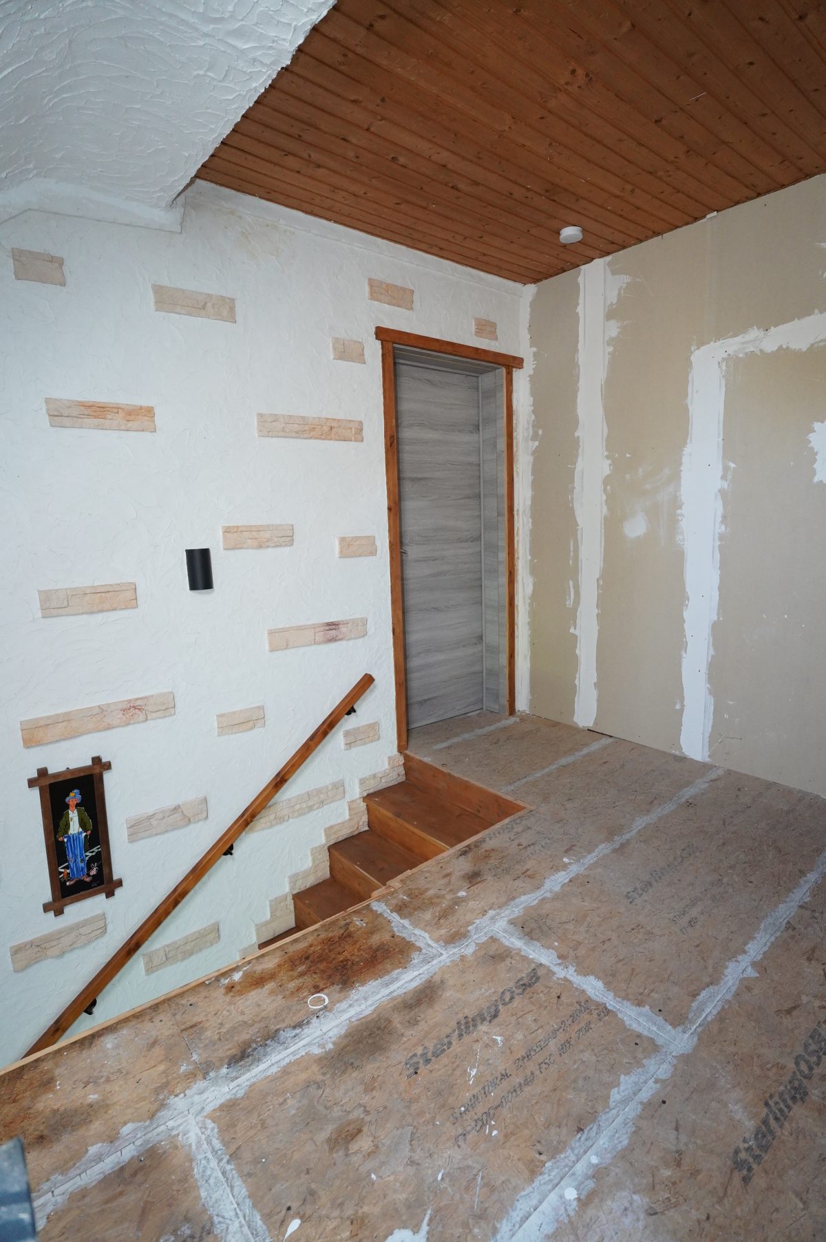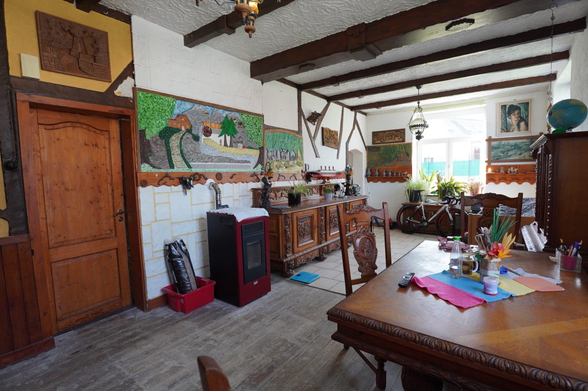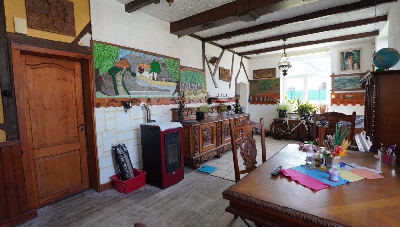 Der Eingangsbereich mit den Treppen zur 1. Etage führt in das große Wohnzimmer, das mit einem gemütlichen Pelletofen ausgestattet ist und viel Tageslicht bietet. Angrenzend befindet sich die funktionale Küche. Im Erdgeschoss befindet sich ebenfalls ein erstes Zimmer, das sich ideal als Schlafzimmer oder Büro eignet, sowie das Badezimmer, das mit einer Badewanne, einem WC und einem Waschbecken ausgestattet ist.