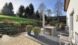 Der lichtdurchflutete Wohnbereich bietet direkten Zugang zur großen Terrasse, die zu entspannten Stunden im Freien einlädt. Der freundliche Garten rundet das Wohngefühl ab – ein Platz für Erholung, Spiel oder Hobby.