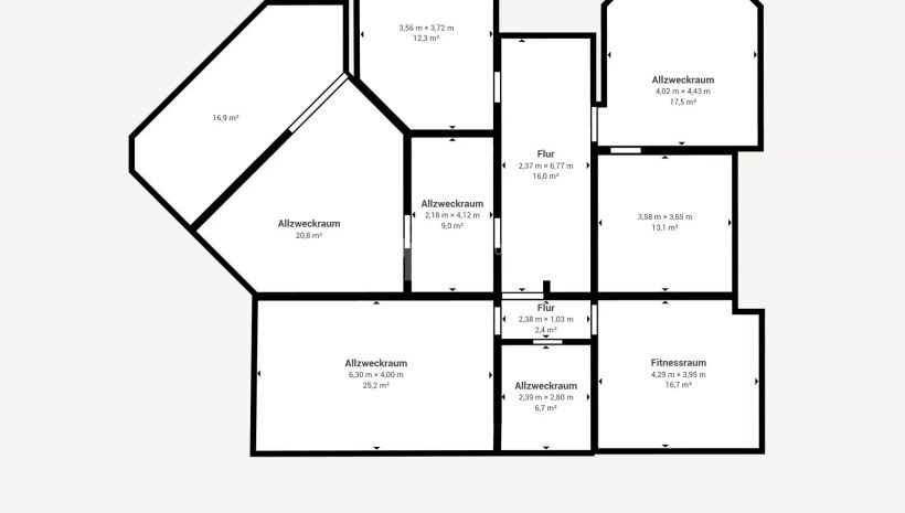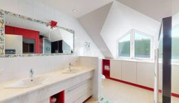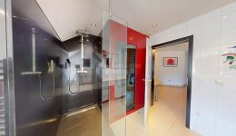 Kellergeschoss : Technikraum (13,1 m²) – Flur (18,4 m²) – 4 Keller (17,50 m² & 12,30 m² & 25,2 m² & 38 m²) – Weinkeller (6,7 m²) – Fitnessraum mit Dusche (16,7 m²)