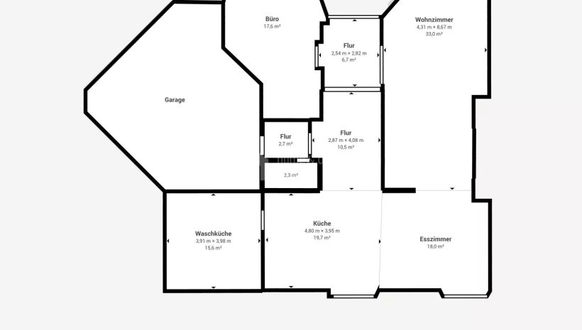 Erdgeschoss : Garage für 2 Autos (39,10 m²) – Eingang (19,90 m²) – Wohnzimmer (33 m²) – Einbauküche (19,70 m²) – Esszimmer (18m²) – Büro (17,60 m²) – Wäscheraum (15,60 m²)
