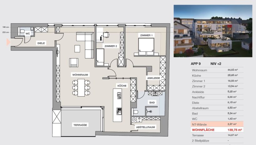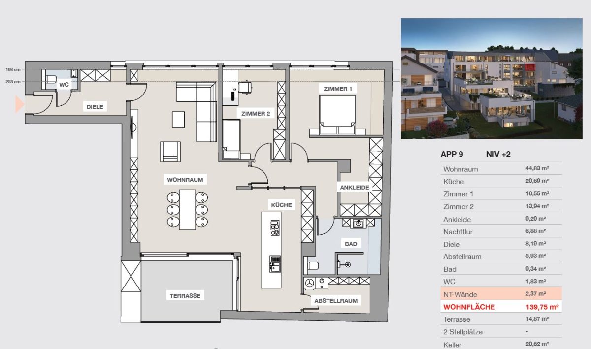 Das Appartement hat eine Fläche von 139,75 m² und bietet Ihnen eine Eingangsdiele, einen Abstellraum, einen offenen Wohnbereich, 2 Schlafzimmer, ein Badezimmer, eine Gästetoilette und eine überdachte Terrasse. Ein Keller von 20,62 m², ein Außenstellplatz und ein Parkplatz in der Tiefgarage runden das Angebot ab.