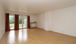 Der Wohn- und Essbereich beeindruckt durch seine Großzügigkeit und den direkten Zugang zur Terrasse, die sich zum innenliegenden Gemeinschaftsgarten hin öffnet. Die Küche, ebenfalls mit Zugang zur Terrasse, ist vom Wohnzimmer getrennt.