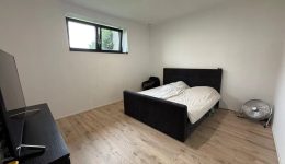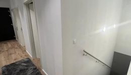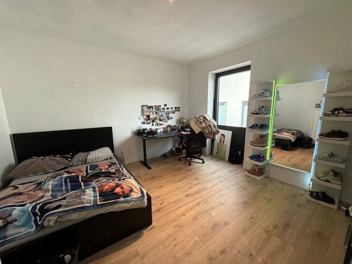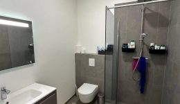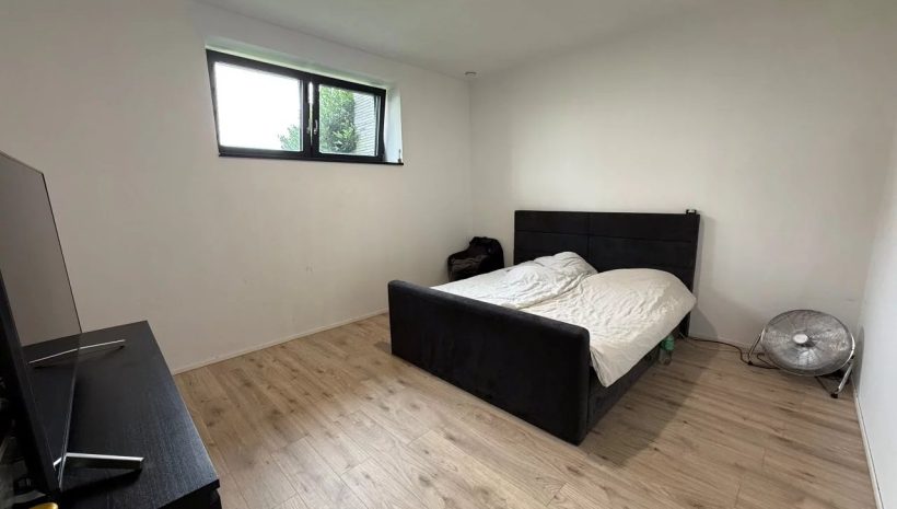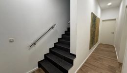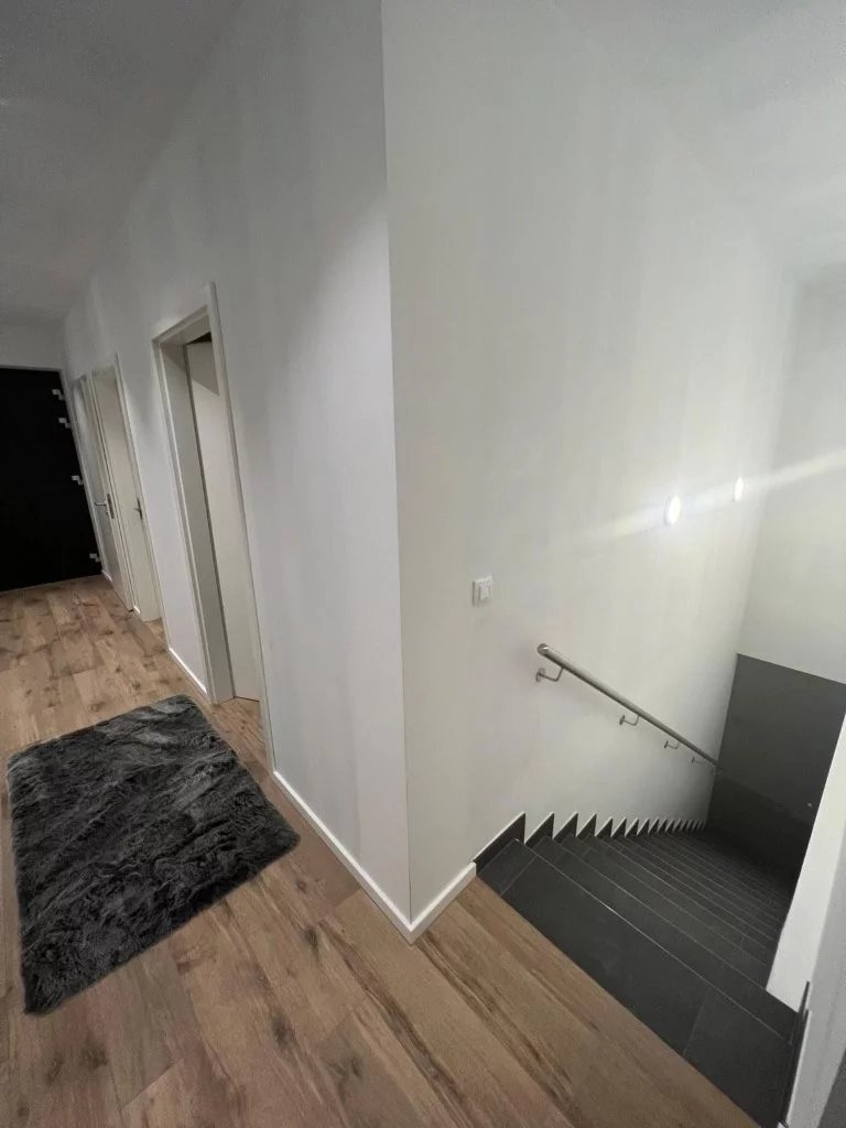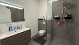 Eine geflieste Treppe führt in die untere Ebene, wo sich eine Nachtdiele (ca. 7 m²) sowie zwei weitere Schlafzimmer befinden, von denen eines derzeit als Ankleideraum mit Einbauschränken genutzt wird. Beide Räume verfügen über Fenster und Laminatboden. Ein zweites Badezimmer, ebenfalls modern gestaltet, bietet eine italienische Dusche, ein großes Waschbecken, Untermöbel und WC.