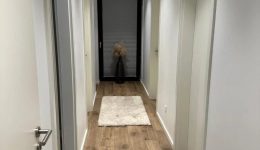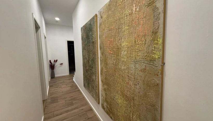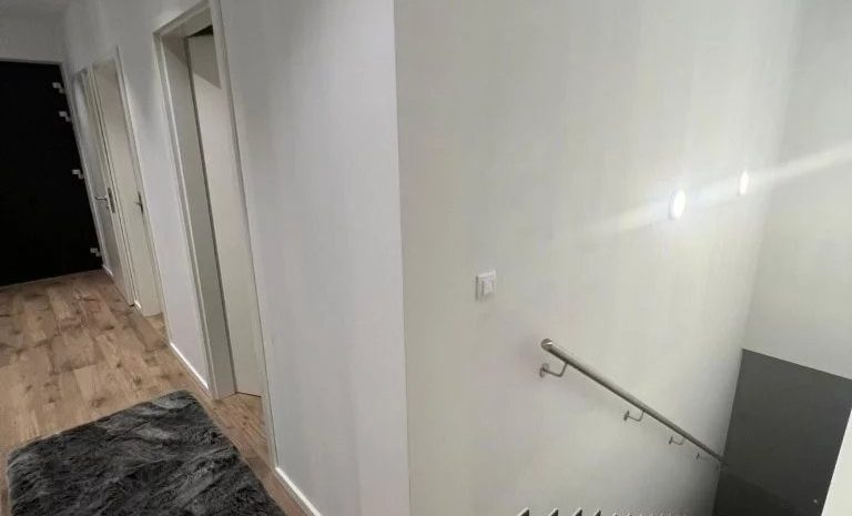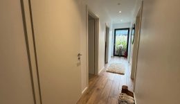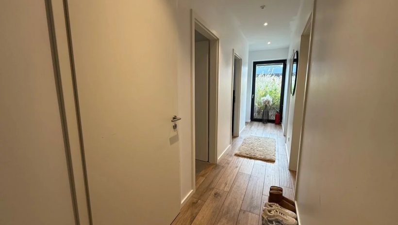 Bereits beim Betreten empfängt Sie ein einladender Flurbereich, dessen gegenüberliegende Fenstertür den Blick auf die Außenvegetation freigibt und den Eingangsbereich mit Tageslicht erfüllt. Die Fliesen in warmer Holzoptik sind nicht nur pflegeleicht, sondern verleihen dem Raum eine behagliche Atmosphäre. Dezente Deckenleuchten sorgen auch bei Dunkelheit für ein angenehmes Licht, während weiße Türen dem Interieur eine helle, elegante Note geben.