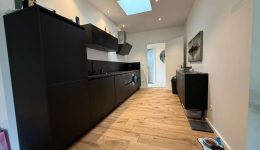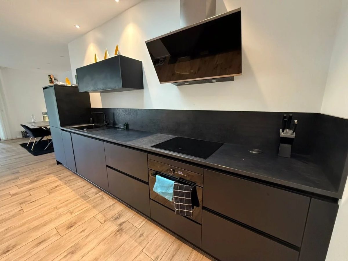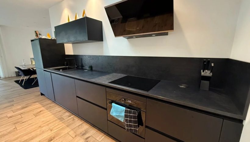 Zur Linken öffnet sich der lichtdurchflutete Wohnbereich mit seiner offenen, modernen Einbauküche, die sich in puristischem Design harmonisch in den Raum einfügt. Wie im Flur wurde auch hier der warme Fliesenboden fortgeführt, was für ein einheitliches, wohnliches Gesamtbild sorgt. Besonders eindrucksvoll sind die großflächigen Fensterfronten mit Blick auf die Terrasse und den Gemeinschaftsgarten – sie erweitern den Raum optisch nach außen und schaffen ein außergewöhnliches Wohngefühl. Ein zusätzliches Deckenfenster bringt zusätzliches Licht in den Küchenbereich und unterstreicht das helle, freundliche Ambiente.