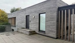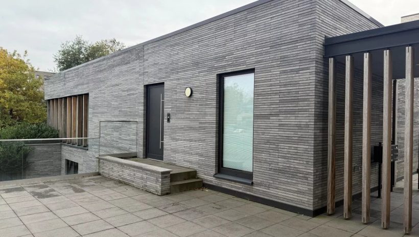 Obwohl die Wohnung Teil eines Mehrfamilienhauses ist, präsentiert sie sich als vollständig getrennte Einheit mit eigenem, persönlichem Eingang – ein wesentlicher Aspekt des angestrebten Bungalow-Charakters mit vier Fassaden.