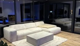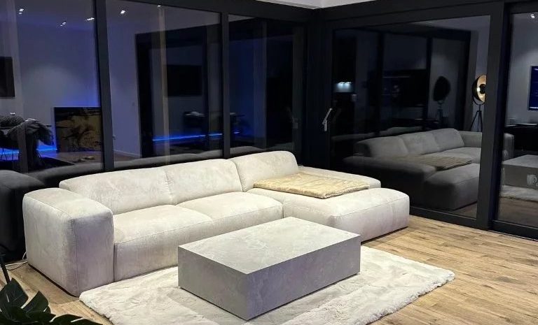 Großformatige Fensterfronten fluten die Räume mit Licht und schaffen eine nahtlose Verbindung zwischen Innen- und Außenbereich. So entsteht ein helles, offenes Wohnambiente, das zu jeder Tageszeit ein Gefühl von Weite und Leichtigkeit vermittelt.
