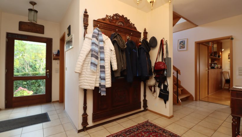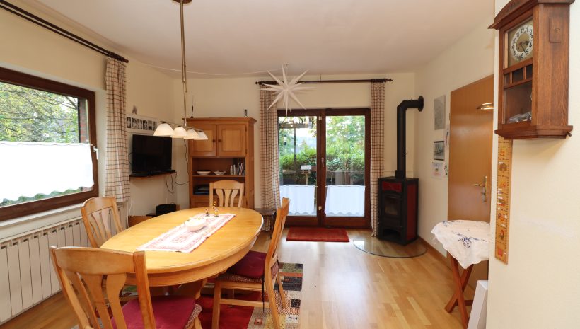 Über den einladenden Eingangsbereich gelangt man in das Herz des Hauses. Im Erdgeschoss befinden sich neben einem Schlafzimmer (Büro oder Gästezimmer) mit angrenzendem Duschbad die Küche mit Kamin und Essbereich sowie das großzügige Wohnzimmer. Sowohl Küche als auch Wohnraum führen direkt auf die sonnige Terrasse und in den Garten – ein idealer Ort, um entspannte Stunden im Grünen zu verbringen.