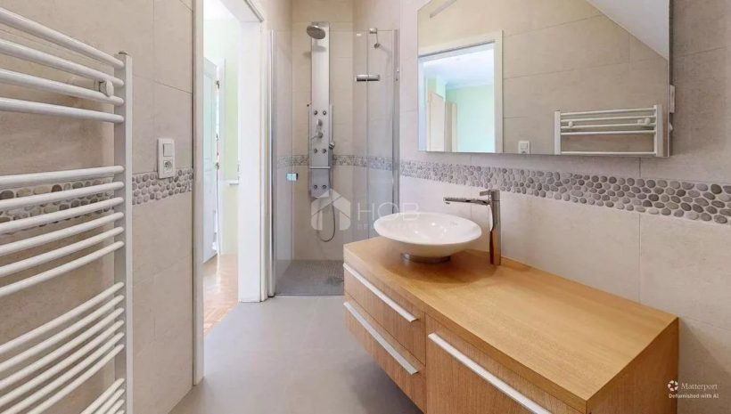 Die Mazout-Heizung wird ergänzt durch eine Warmwasseraufbereitung über Solar, zudem steht eine Regenwasserzisterne zur Verfügung. Das Schieferdach rundet das hochwertige Gesamtbild ab.