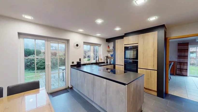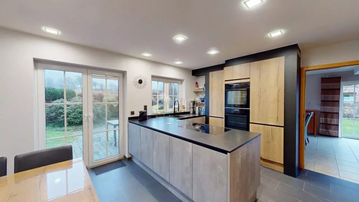 Die moderne Einbauküche ist funktional und stilvoll gestaltet. Von hier aus gelangen Sie direkt auf die sonnige Terrasse mit Blick in den liebevoll angelegten Garten – ein wahres Paradies für Naturliebhaber und Ruhesuchende.