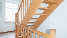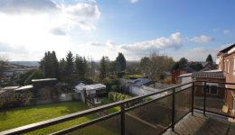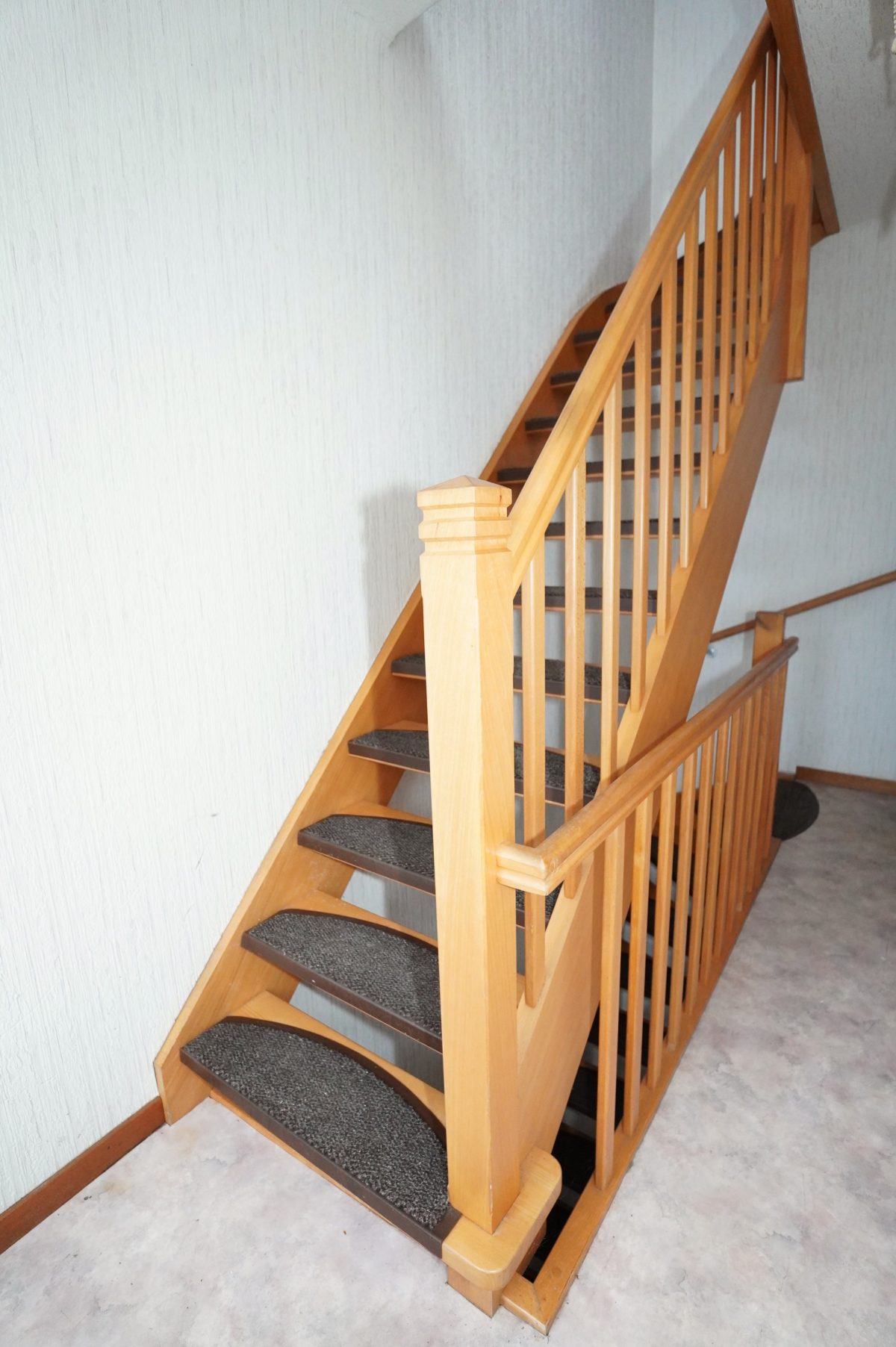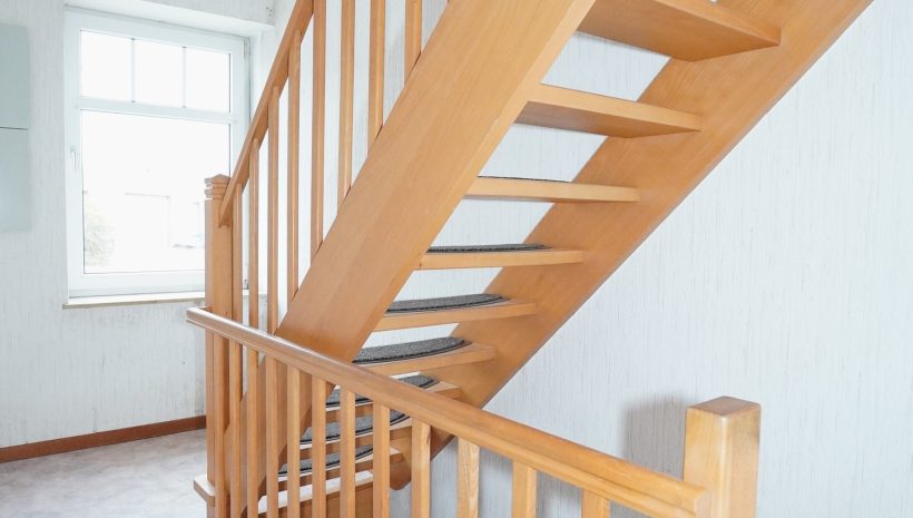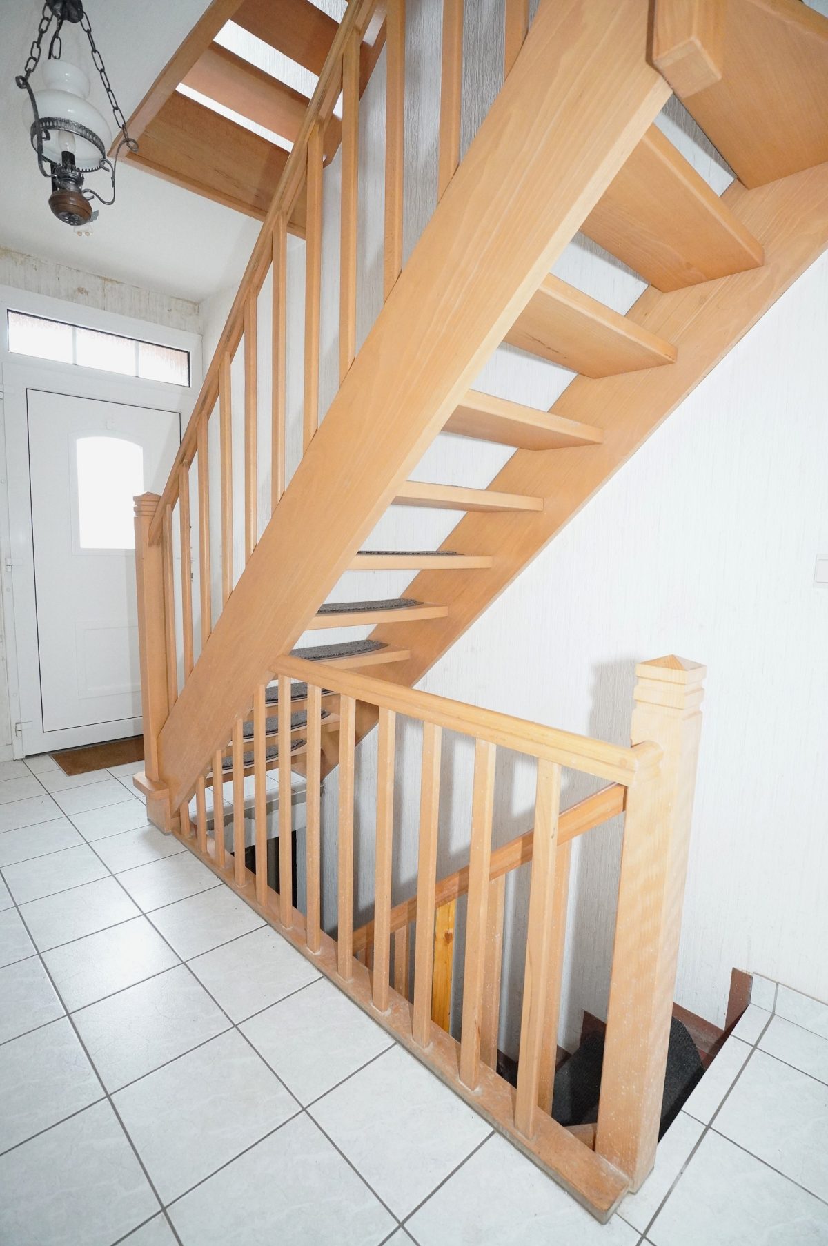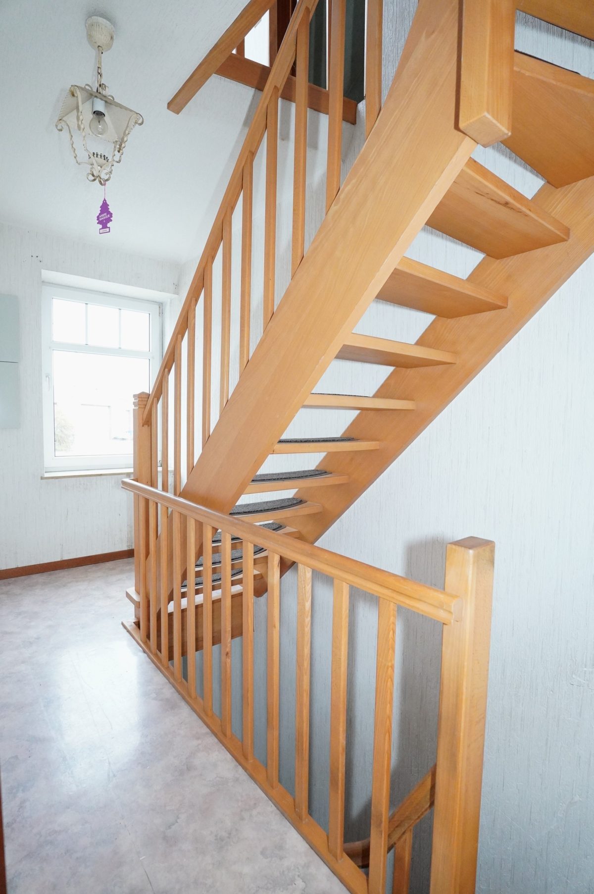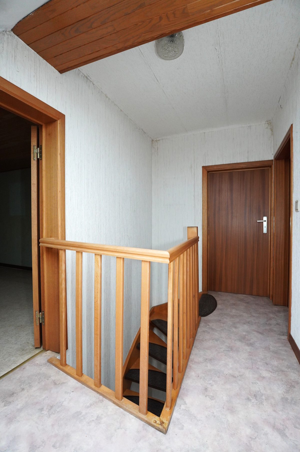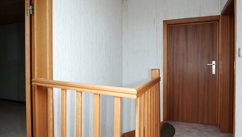 1. Stock: Flur mit Holztreppenhaus, das zum zweiten Stock führt. Heller Wohnbereich mit Zugang zum ideal besonnten Balkon, Küchenbereich, der problemlos in ein zusätzliches Schlafzimmer umgewandelt werden könnte, ein Schlafzimmer sowie ein zweites Badezimmer mit Dusche, Waschbecken und WC.