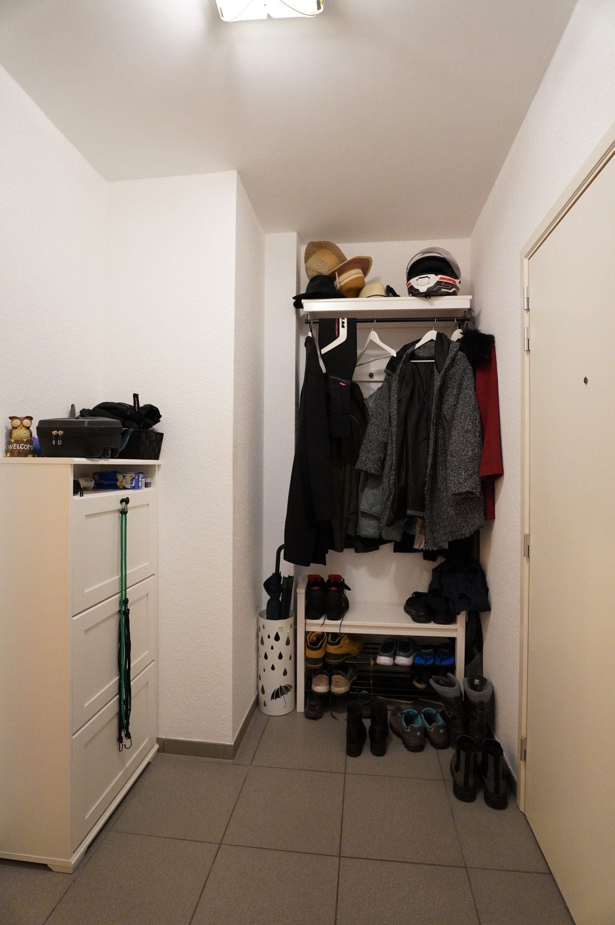 Aufteilung der Wohnung: Eingangsbereich mit Garderobe, geräumige separate Toilette, Abstellraum, sehr großes Wohnzimmer mit Zugang zu einem Balkon (seitlich am Gebäude gelegen), Einbauküche, Nachtdiele, Waschküche mit den Anschlüssen für die Waschmaschine und die zentrale Stadtgasheizung; zwei Schlafzimmer (das größere mit kleinem Balkon); ein Badezimmer mit Waschbecken, WC und Badewanne, ein privater Parkplatz im Untergeschoss.