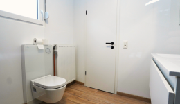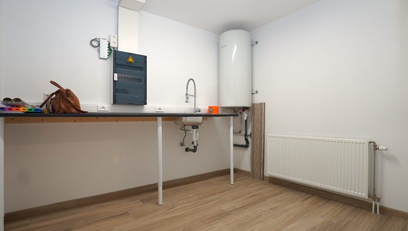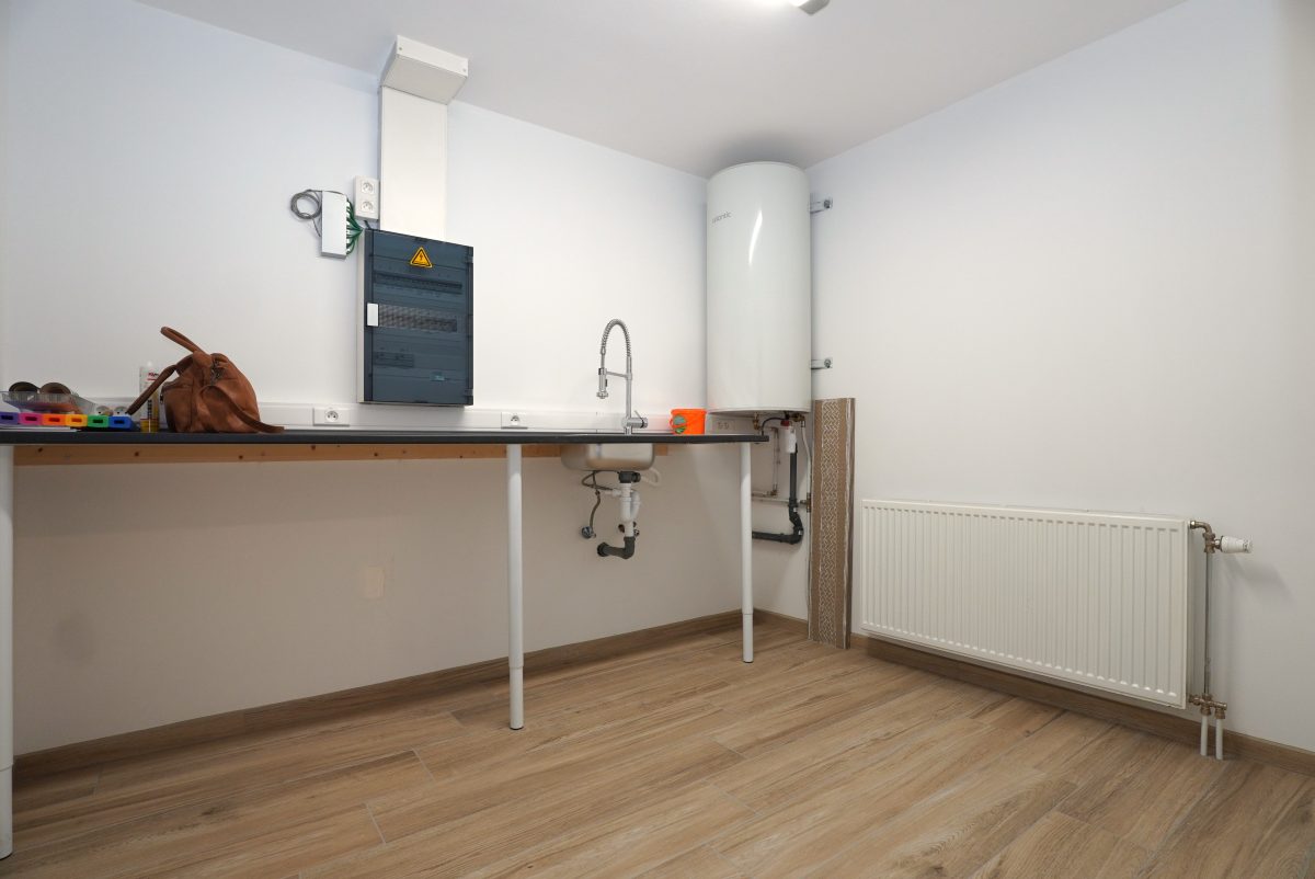 Erdgeschoss: einladende Eingangsbereich, ein Büro sowie eine Waschküche mit Anschlüssen für Waschmaschinen, einschließlich Warmwasserboiler und technischen Anlagen.