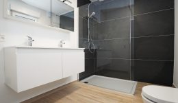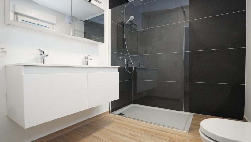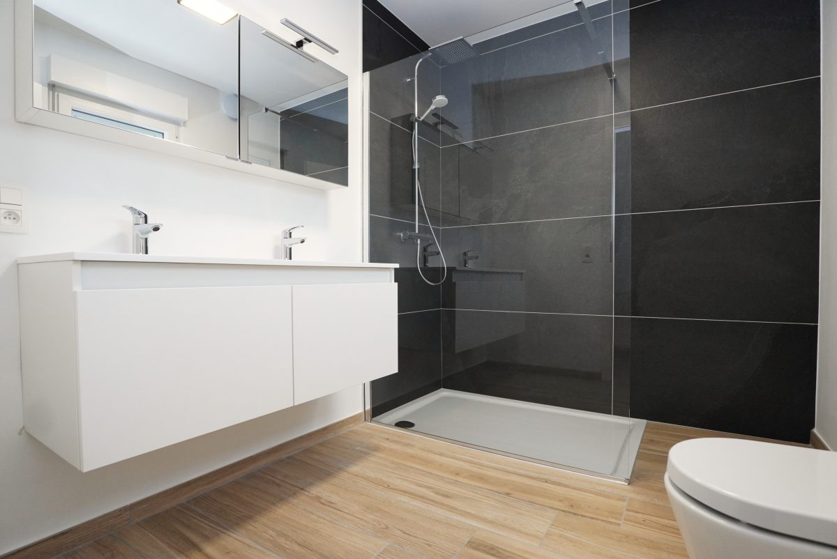 Erster Stock: Flur mit Zugang zum Dachboden, schöne ausgestattete Küche offen zum hellen Wohnbereich, zwei komfortable Schlafzimmer sowie ein modernes Badezimmer mit ebenerdiger Dusche, Waschbeckenmöbel und WC.