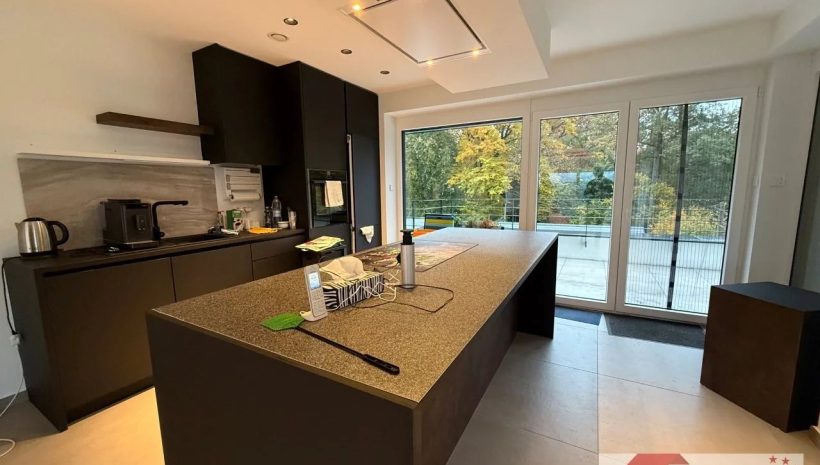 La cuisine équipée haut de gamme s’intègre harmonieusement à l’ensemble et invite à partager des moments agréables autour d’un repas ou d’un verre, avec vue sur la verdure.