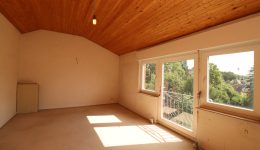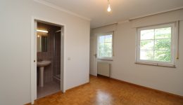 Im Obergeschoss befinden sich zwei großzügige Schlafzimmer sowie ein weiteres Zimmer, das sich flexibel als Gäste-, Kinder- oder Ankleidezimmer nutzen lässt. Zusätzlich verfügt eines der Schlafzimmer über ein kleines Badezimmer mit Dusche, Waschbecken und WC. Das große Badezimmer ist mit einer Badewanne, einer separaten Dusche, einem Waschtisch und einem WC ausgestattet. Zwei weitere, relativ große Abstellräume auf dieser Etage bieten viel Stauraum und können bei Bedarf auch als Schlafzimmer genutzt werden, wobei einer dieser Räume ein Durchgangszimmer ist.