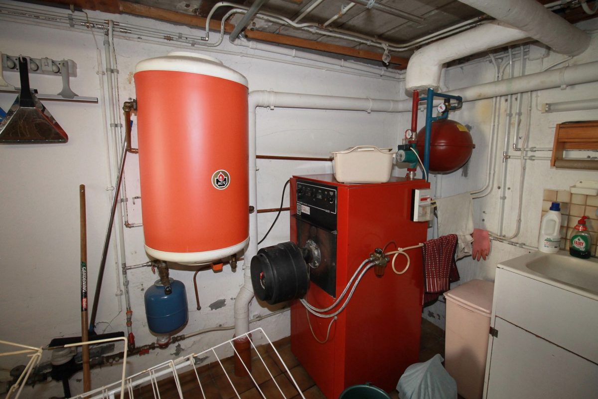 Erdgeschoss: Heizraum mit Ölzentralheizung, Abstellräume, Heizöltank, zwei Garagen und eine kleine Werkstatt.