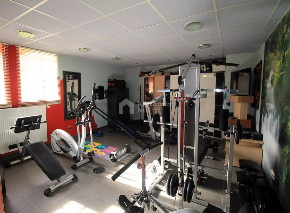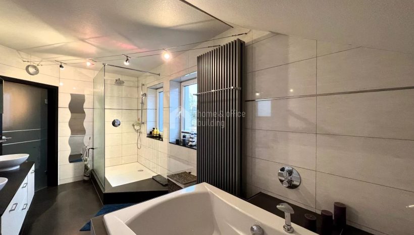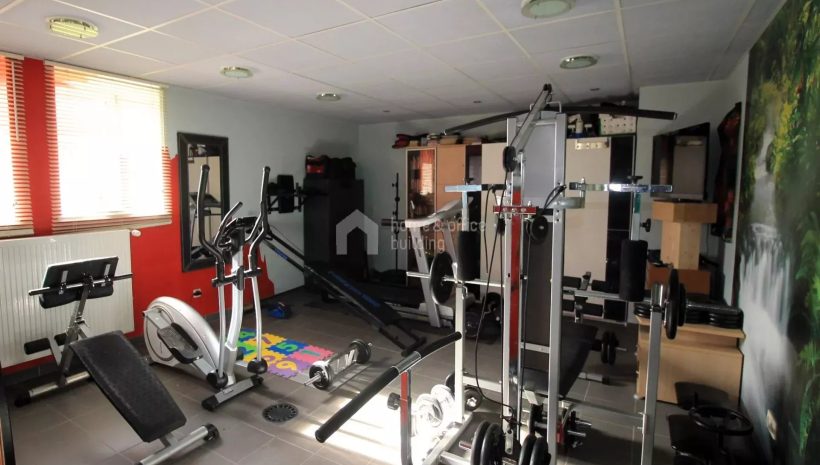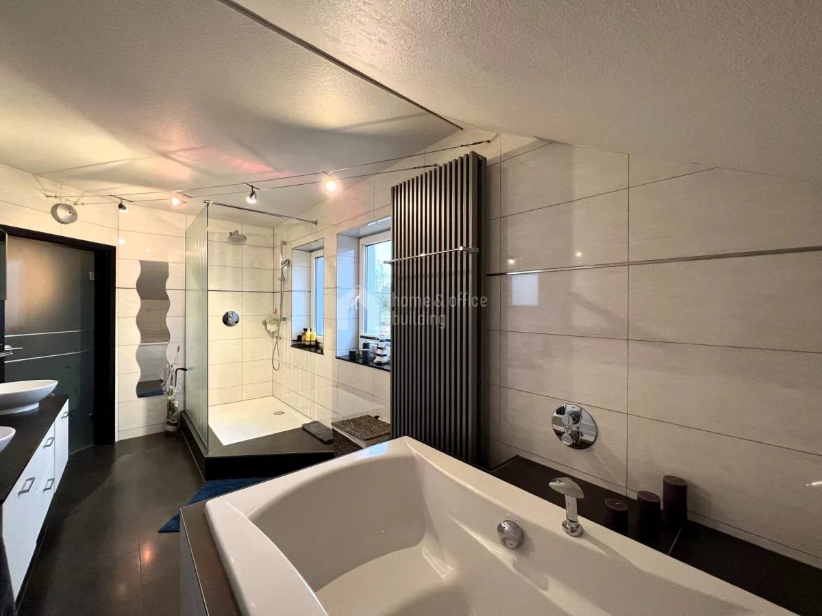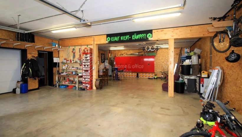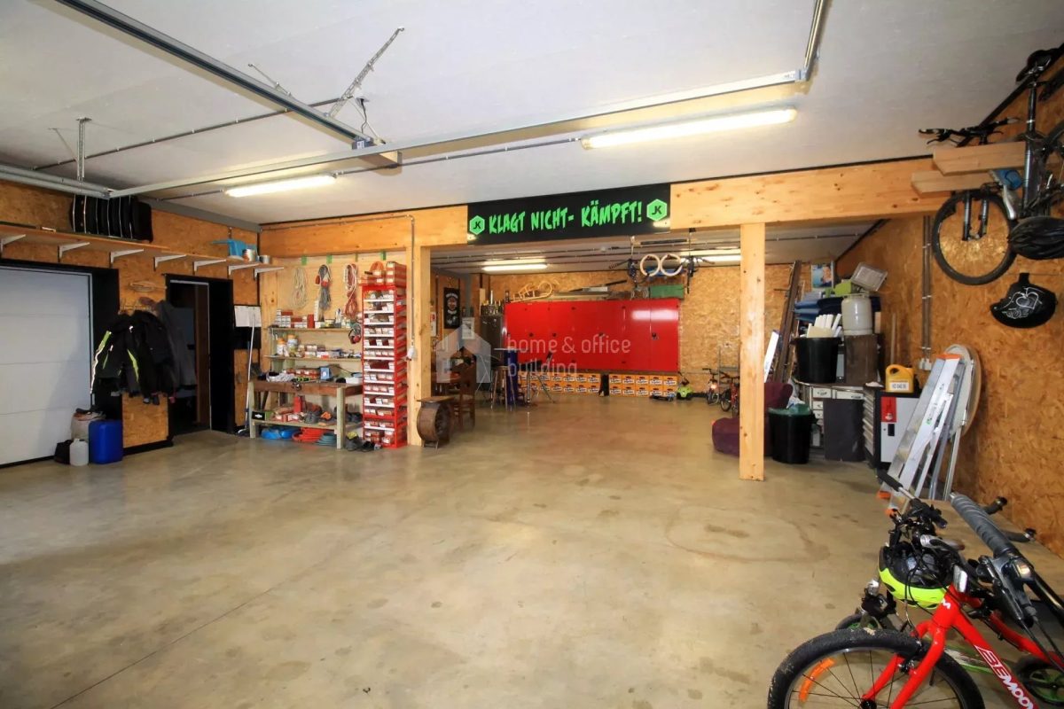 Zusätzlich verfügt die Immobilie über ein großzügiges Untergeschoss mit einer geräumigen Garage für mehrere Fahrzeuge. Hier finden Sie weitere Räumlichkeiten, darunter ein Büro, einen Hauswirtschaftsraum, ein Badezimmer mit Dusche und WC, einen Fitnessraum sowie den Heizraum.