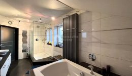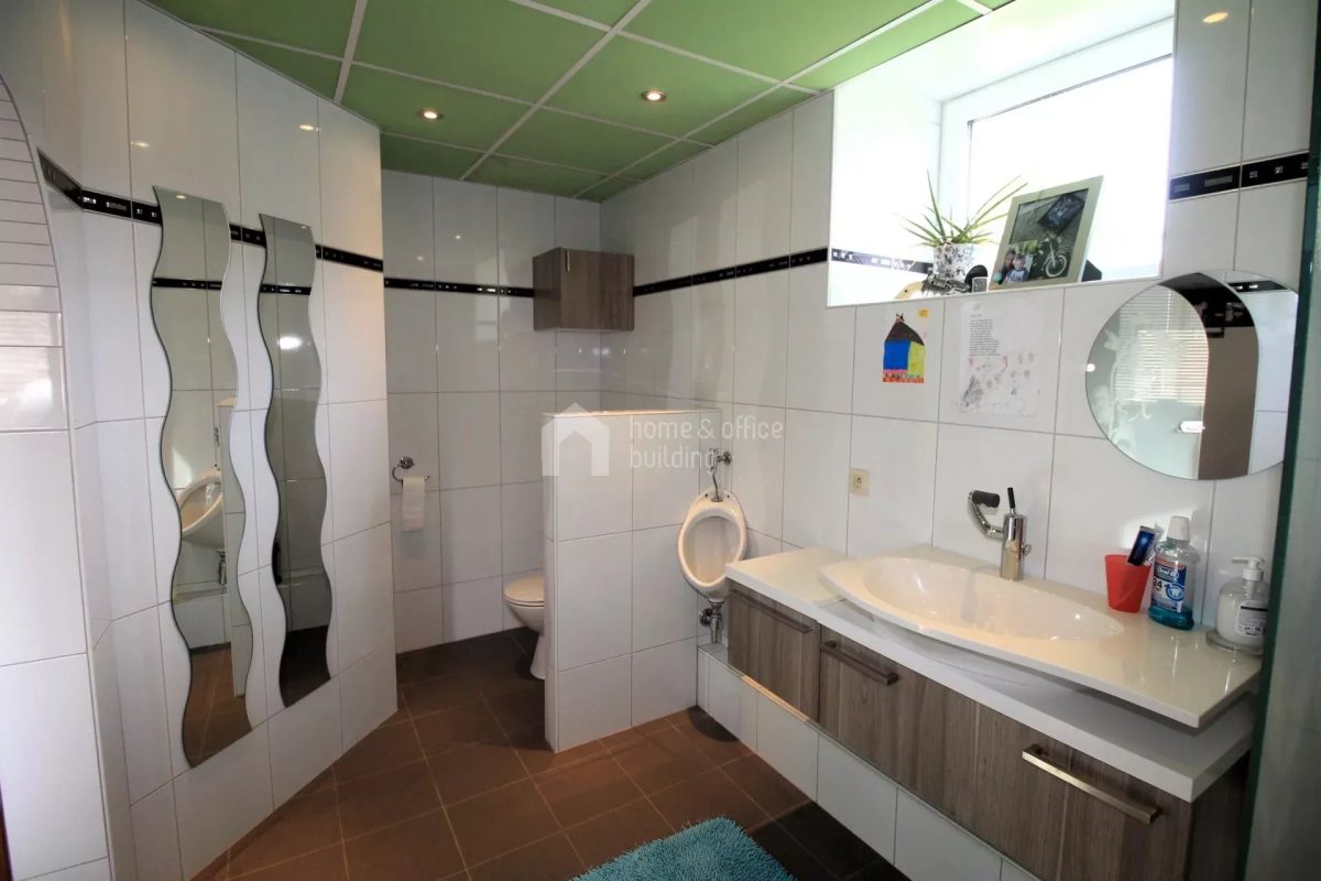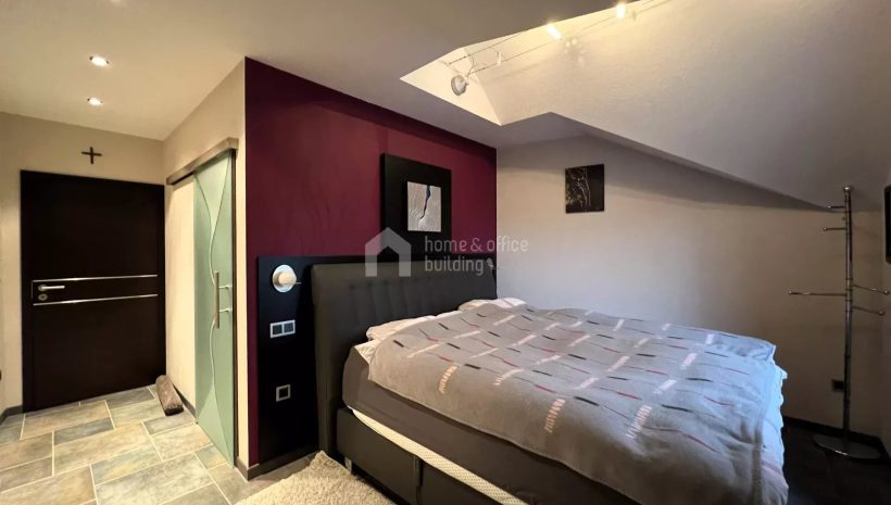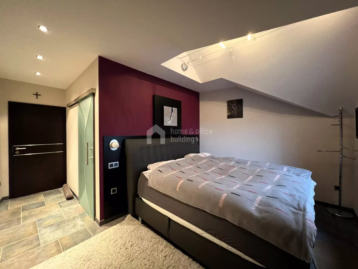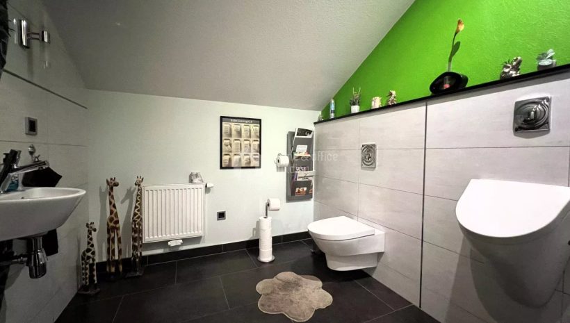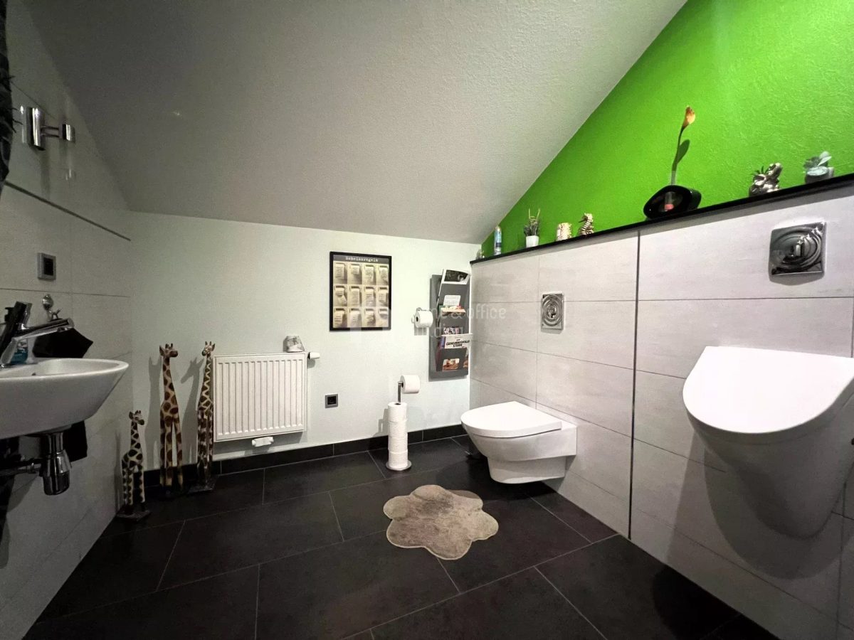 Zusätzlich verfügt die Immobilie über ein großzügiges Untergeschoss mit einer geräumigen Garage für mehrere Fahrzeuge. Hier finden Sie weitere Räumlichkeiten, darunter ein Büro, einen Hauswirtschaftsraum, ein Badezimmer mit Dusche und WC, einen Fitnessraum sowie den Heizraum.