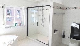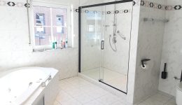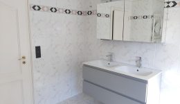 Living und Schlafzimmer mit Eichenparkett, modernes Bad mit Dusche, Whirlpool, Doppelwaschtisch und WC.