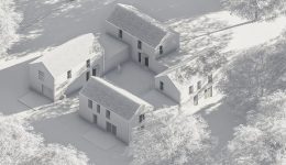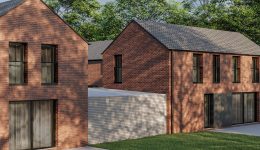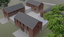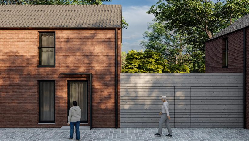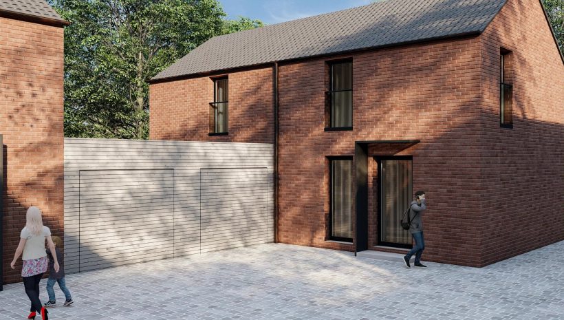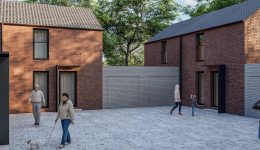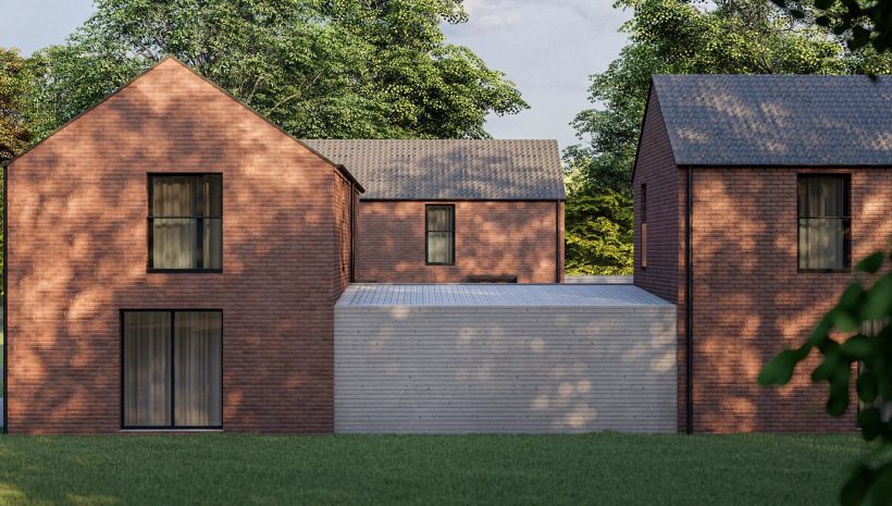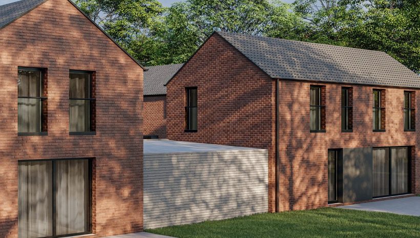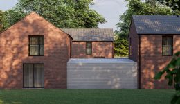 Die harmonisch in die Umgebung integrierten Einfamilienhäuser mit Satteldach, 2 Vollgeschossen und Klinkerfassade mit attraktivem Innenhof besteht aus vier Objekten (Baubeginn Spätsommer 2024).