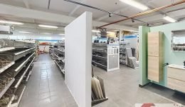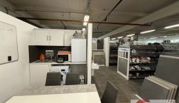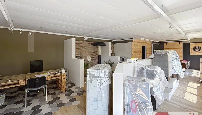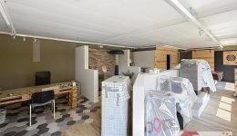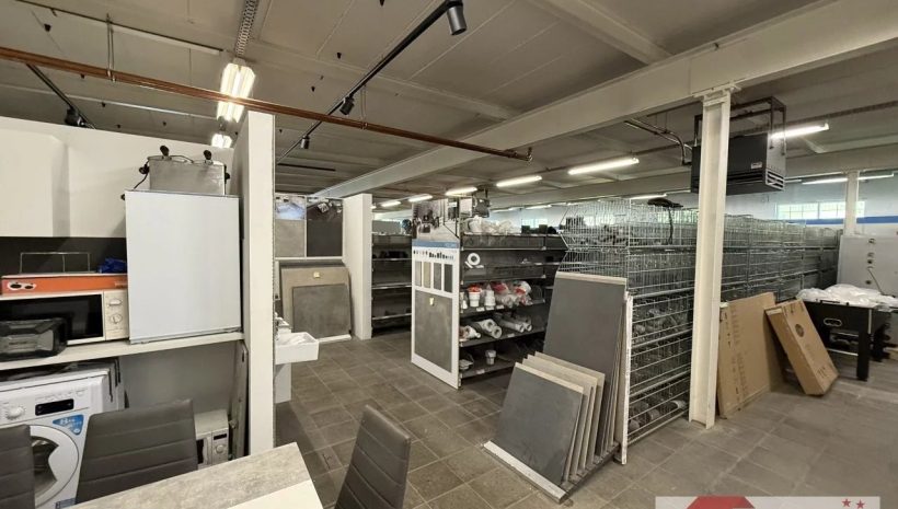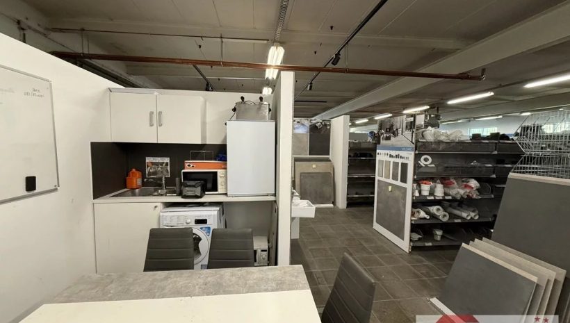 Ergänzt wird das Angebot durch ein ebenfalls neu renoviertes, rund 80 m² großes Büro, das mit einem modernen, gefliesten Badezimmer mit Dusche, Waschbecken und WC ausgestattet ist. Die Bürofläche ist intelligent aufgeteilt und umfasst einen großzügigen Ausstellungs- bzw. Empfangsraum, ein separates Büro, einen Besprechungsraum, eine Küche, ein weiteres WC, einen separaten Personaleingang sowie einen Abstell- oder Archivraum. Auch hier sorgen große Fensterflächen für eine angenehme Helligkeit und eine freundliche Arbeitsatmosphäre.