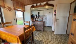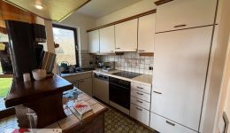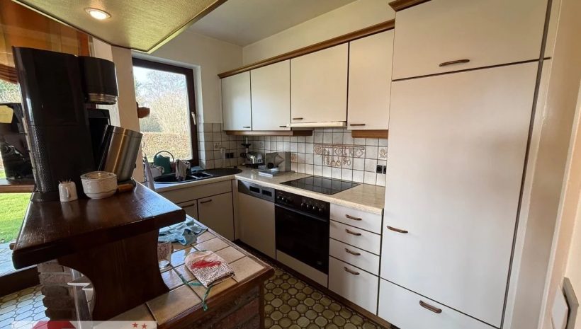 Der Küchenbereich ist aktuell mit einer Theke ausgestattet und funktional gestaltet. Auch wenn das Design nicht mehr vollständig den neuesten Trends entspricht, bietet die Küche eine solide Grundlage und kann bei Bedarf modernisiert werden. Zwischen Küche und Esszimmer sorgt eine halb offene Raumtrennung für eine angenehme Gliederung, ohne die Großzügigkeit des gesamten Wohnraums zu beeinträchtigen. Neben der Küche befindet sich außerdem ein praktischer Abstellraum.