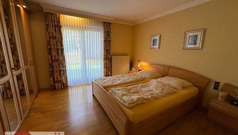 Der Zugang zum Haus erfolgt über eine gepflegte Blausteintreppe, die zum Eingangsbereich führt. Die seitlich im Haus integrierte Garage ist bequem über eine geteerte Zufahrt erreichbar und fügt sich harmonisch in die Architektur des Gebäudes ein.