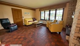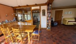 Der Wohnbereich überrascht durch seine offene und großzügige Gestaltung, die für ein Haus aus dem Baujahr 1978 bemerkenswert modern wirkt. Auf einer Fläche von rund 55 m² entfaltet sich ein L-förmig angelegter Raum, der Wohnzimmer, Essbereich und Küche harmonisch miteinander verbindet. Besonders charakteristisch sind die warmen Holzelemente an der Decke, die teilweise mit dekorativen Natursteinverkleidungen an den Wänden kombiniert wurden. Zusammen mit dem Terracotta-Boden entsteht eine Atmosphäre, die gleichzeitig gemütlich und einladend wirkt. Der Wohnbereich selbst wird durch einen Kamin ergänzt, der besonders in den kälteren Monaten für eine behagliche Atmosphäre sorgt und zum zentralen Treffpunkt des Hauses wird. Von hier aus gelangt man direkt auf die teilweise überdachte Terrasse und den Garten.