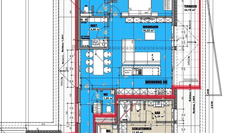 Wohnfläche: ca.72 m² – Terrasse: ca. 11 m²- Keller 08 – Tiefgaragenstellplatz 8a + 1 Außenstellplatz