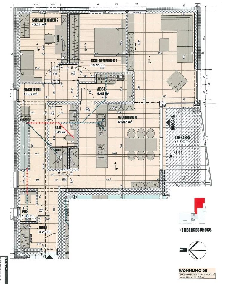 Wohnfläche: ca. 111,09 m² – Terrasse: ca. 11,66m²- Keller 05: 15,30 m² – Tiefgaragenstellplatz 5A + 1 Außenstellplatz