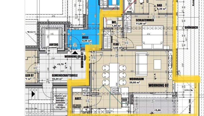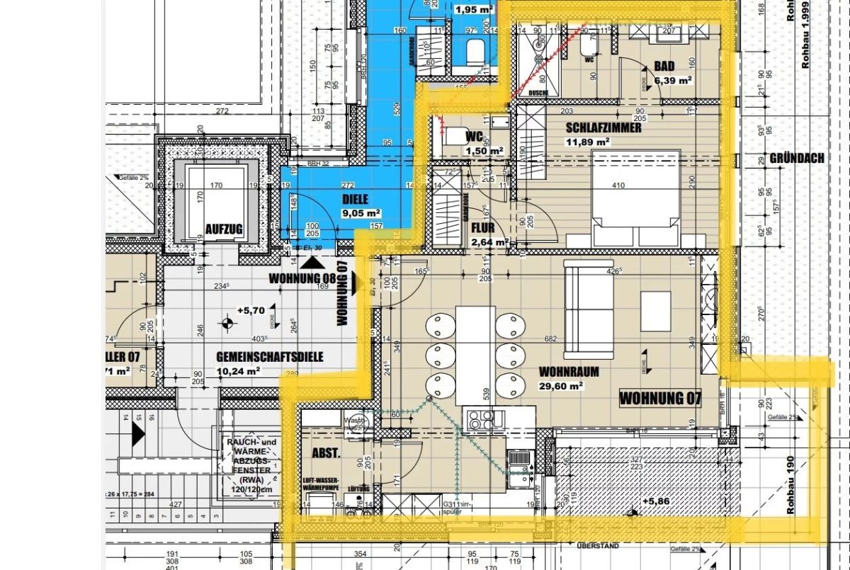 Wohnfläche: ca. 117 m² – Terrasse: ca. 11,85m²- Keller 02: 15,30 m² – Tiefgaragenstellplatz 2A + 1 Außenstellplatz