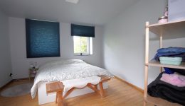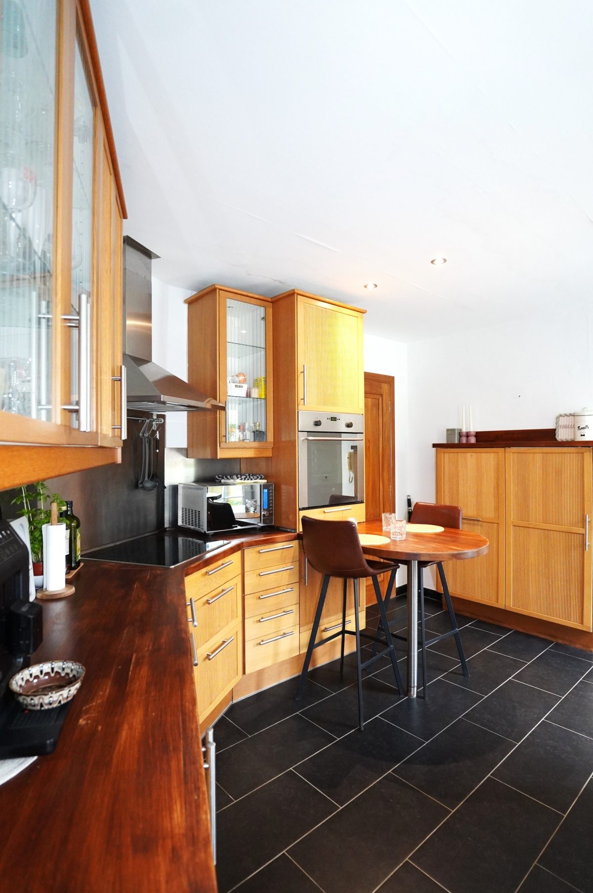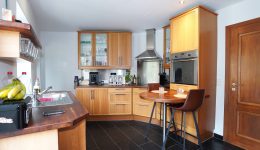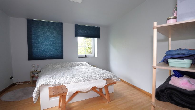 Ausgestattete Küche, helles Esszimmer mit Holzofen, großes Wohnzimmer, kleiner Abstellraum, separates WC, Hauswirtschaftsecke mit Anschluss für Waschmaschine, 1 Schlafzimmer mit Parkettboden, Treppe zum ersten Stock, der ein zweites Schlafzimmer sowie das Badezimmer mit Dusche, Badewanne, WC und Waschtischmöbel umfasst.