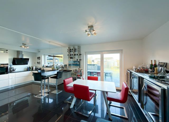 Im Erdgeschoss befinden sich eine helle Eingangshalle, ein separates WC sowie ein großzügiger und gemütlicher Wohnbereich mit komfortablem Wohnzimmer und voll ausgestatteter offener Küche, die funktional und modern gestaltet ist. Eine angrenzende Garage vervollständigt dieses Geschoss. Zusätzlich verfügt die Immobilie im Außenbereich über drei private Stellplätze, die einen hohen Komfort für mehrere Fahrzeuge oder Besucher bieten.