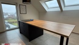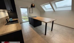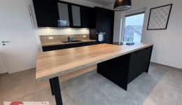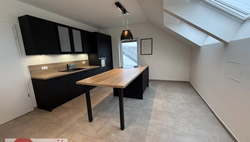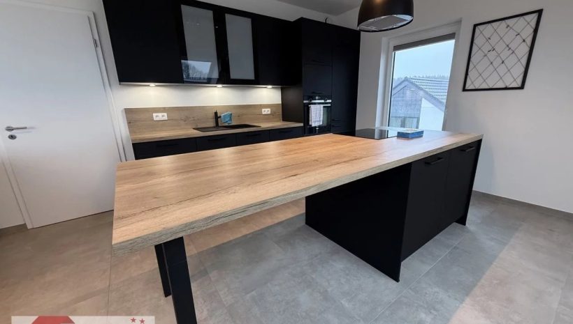 Die moderne, hochwertige Einbauküche in elegantem Schwarz mit warmen Holzakzenten und Kochinsel ist voll ausgestattet und lässt keine Wünsche offen. Dank bodentiefem Fenster sowie zusätzlicher Dachfenster ist auch dieser Bereich lichtdurchflutet und lädt zum gemeinsamen Kochen und Genießen ein.