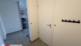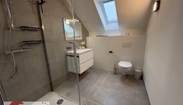 Das zeitlos gestaltete Badezimmer ist mit einer bodenebenen Dusche, Waschbecken und Hänge-WC ausgestattet und bietet einen komfortablen Start in den Tag. Ergänzt wird das Raumangebot durch einen technischen Raum beziehungsweise Hauswirtschaftsraum von etwa 9 m², der ausreichend Platz für Waschmaschine und zusätzlichen Stauraum bietet.